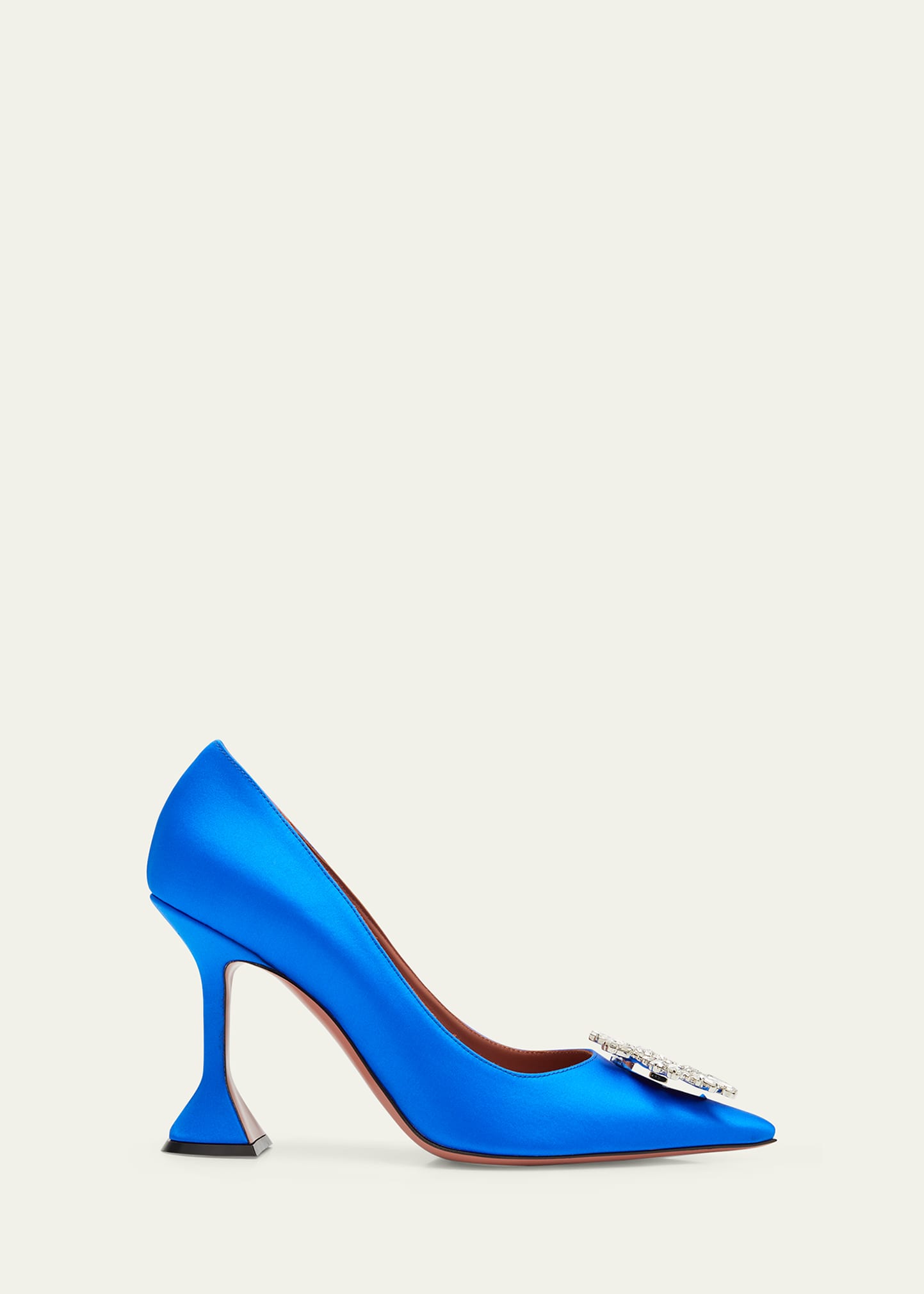 Amina Muaddi "Begum" satin pumps with crystal ornament 3.75 in / 95 mm pedestal stiletto heel Pointed toe Slip-on style Leather/Rubber outsole Lining: Leather Made in Italy