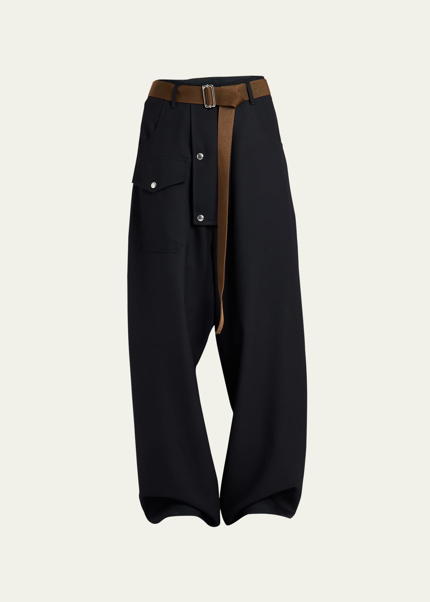 Plan C pants with cargo pockets and contrasting slide belt Mid rise Side slip pockets; back patch pockets Wide legs Full length Belt loops Wool Dry clean Made in Italy