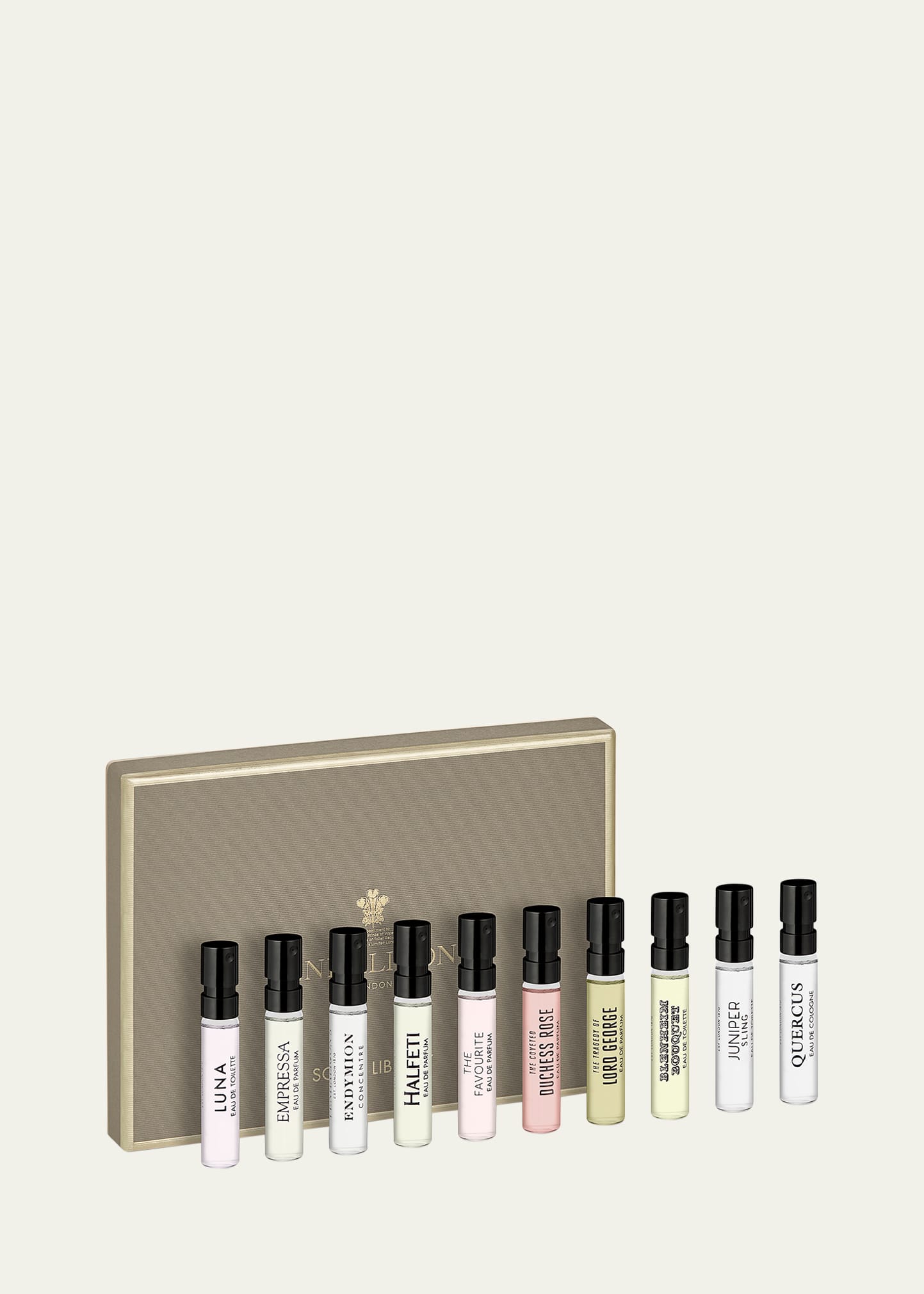 Luna Eau de Toilette, 2 mL Empressa Eau de Toilette, 2 mL Endymion Concentre, 2 mL Halfeti Eau de Parfum, 2 mL The Favourite Eau de Parfum, 2 mL Duchess Rose Eau de Parfum, 2 mL Lord George Eau de Parfum, 2 mL Blenheim Bouquet Eau de Toilette, 2 mL Juniper Sling Eau de Toilette, 2 mL Quercus Eau de Cologne, 2 mL How to Use: Spritz a light mist of fragrance on your pulse points. Do not spray onto clothing as the essential oils can cause garment discoloration or stains. Do not spray near.