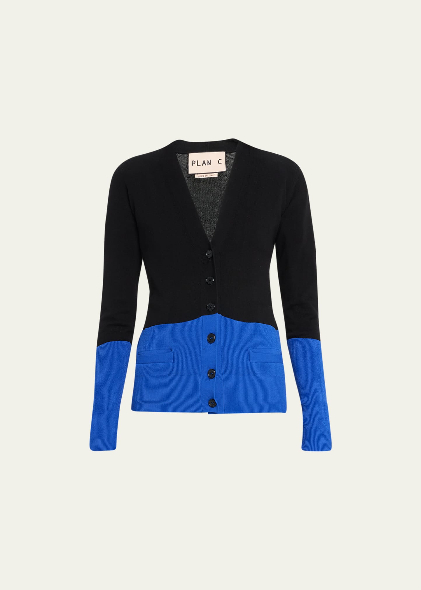 Plan C button-front cardigan with a colorblock styling V-neckline Long sleeves Ribbed cuffs and hem Hip length Relaxed fit Cotton Made in Italy
