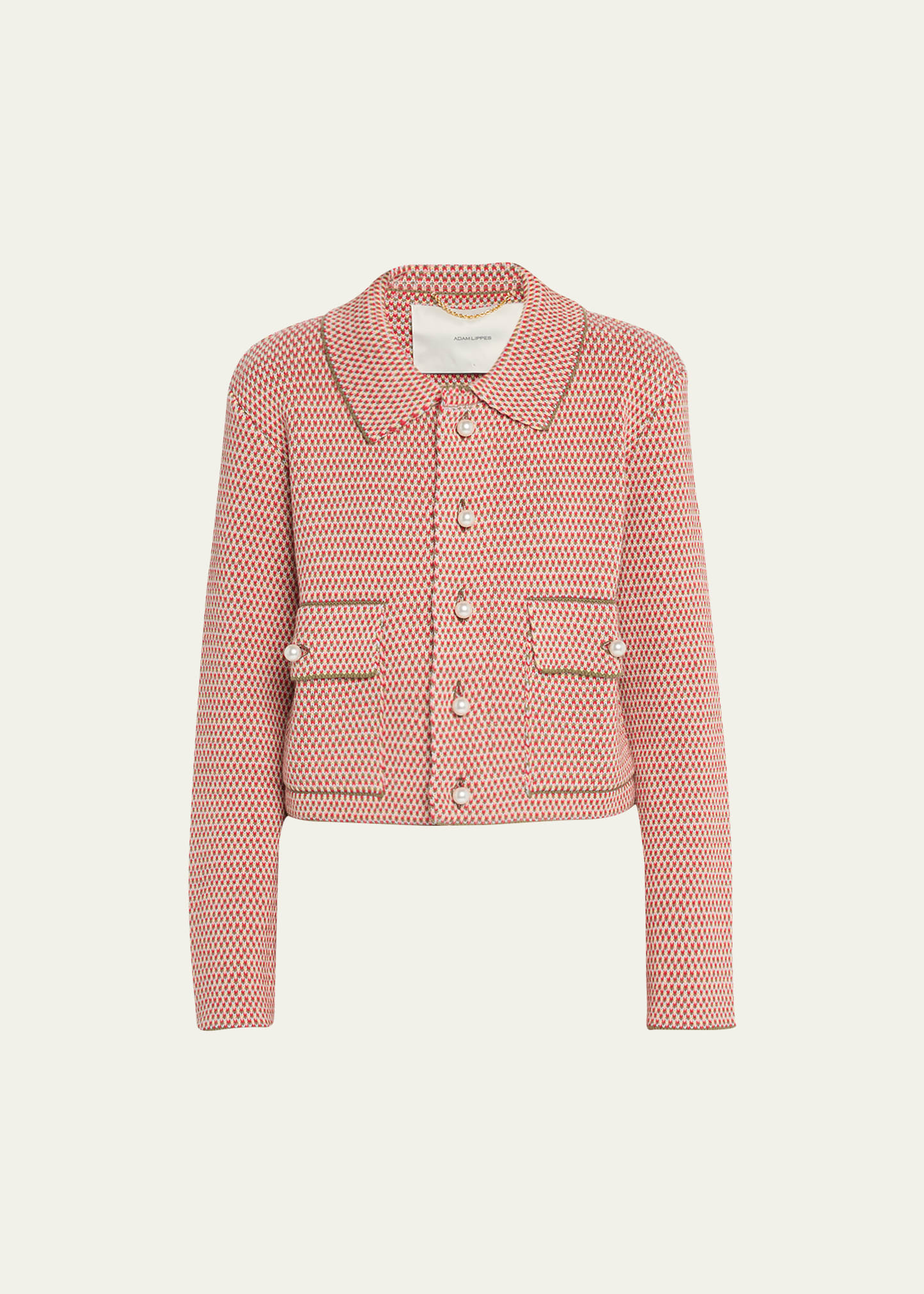 Adam Lippes birdseye tweed knit jacket Spread collar; button front Long sleeves Hip flap pockets Straight fit Cropped length Cotton Dry clean Made in USA
