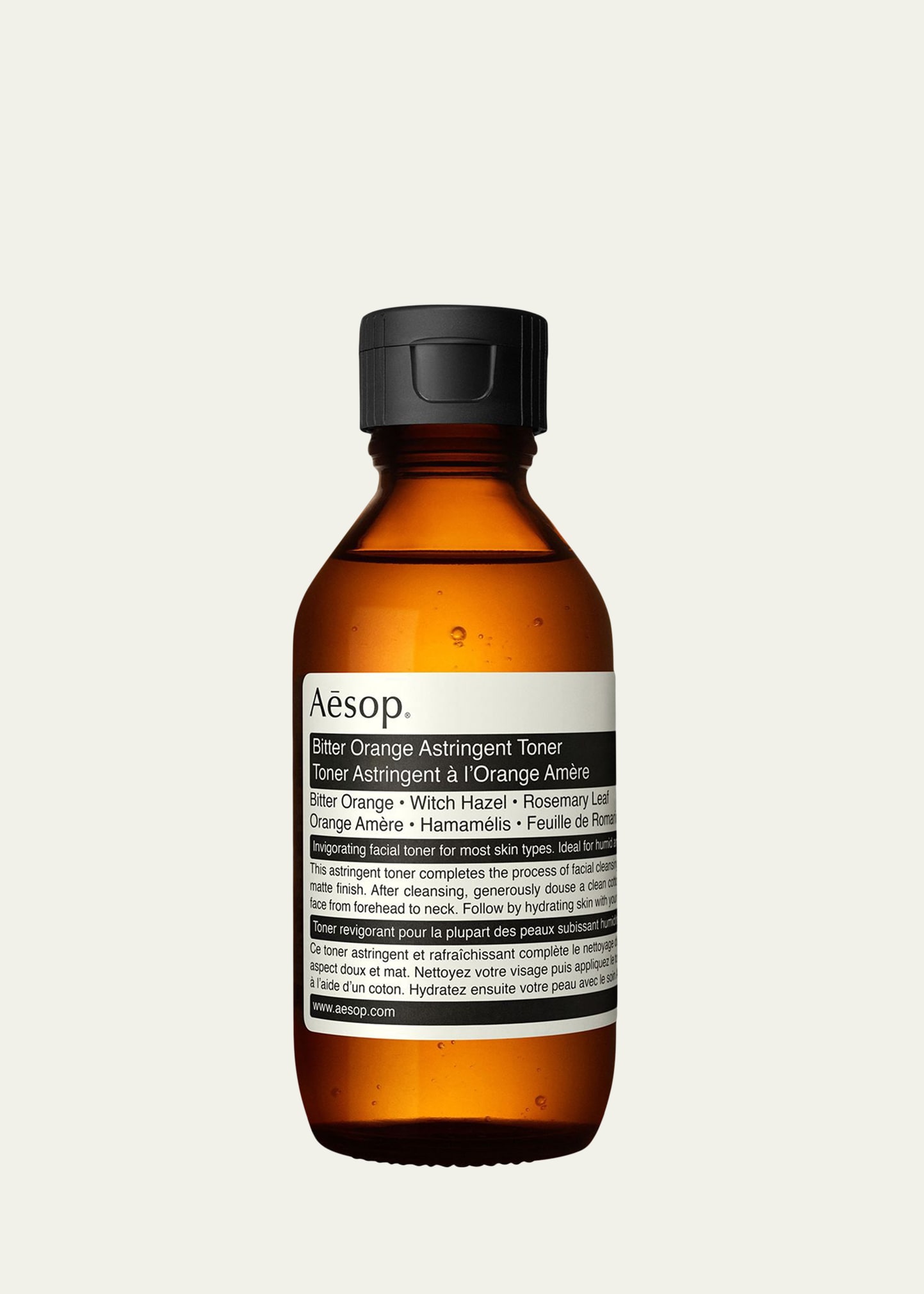 Aesop Bitter Orange Astringent Toner, 3.4 oz. A nondrying, citrus-based formulation that removes residual sweat and grime while clarifying, soothing and balancing the skin. How to Use: Morning and evening, splash onto a cotton pad or directly into hands, and pat onto freshly cleansed skin. Suited for: Most skin types, particularly oily or blemish-prone. Key Ingredients: Bitter Orange, Witch Hazel, Rosemary Leaf Ingredients Listed: Water (Aqua), Alcohol Denat, Hamamelis Virginiana (Witch Haze.