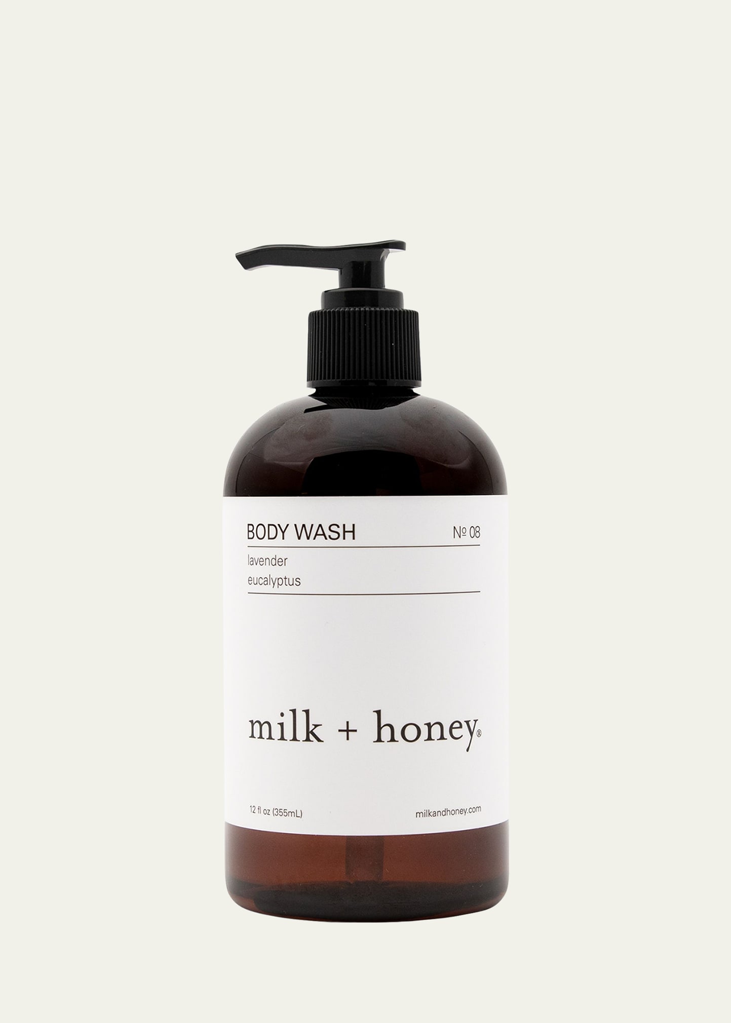 milk + honey Body Wash No.08 (Lavender & Eucalyptus), 12 oz. / 355ml Cleanse. This calming body wash is made with organic castile soap, infused with a soothing blend of organic lavender and eucalyptus essential oils, and helps to support focus and concentration. Directions: A small amount will go a long way.