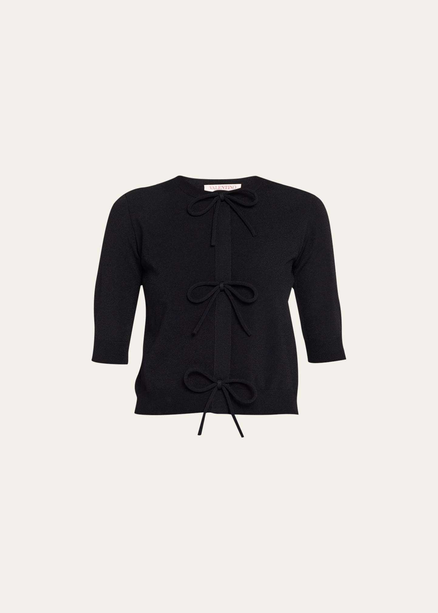 Valentino Garavani jersey cardigan with dainty bow ties Round neckline; covered placket Elbow length sleeves Relaxed fit Cropped length Viscose/polyester Made in Italy