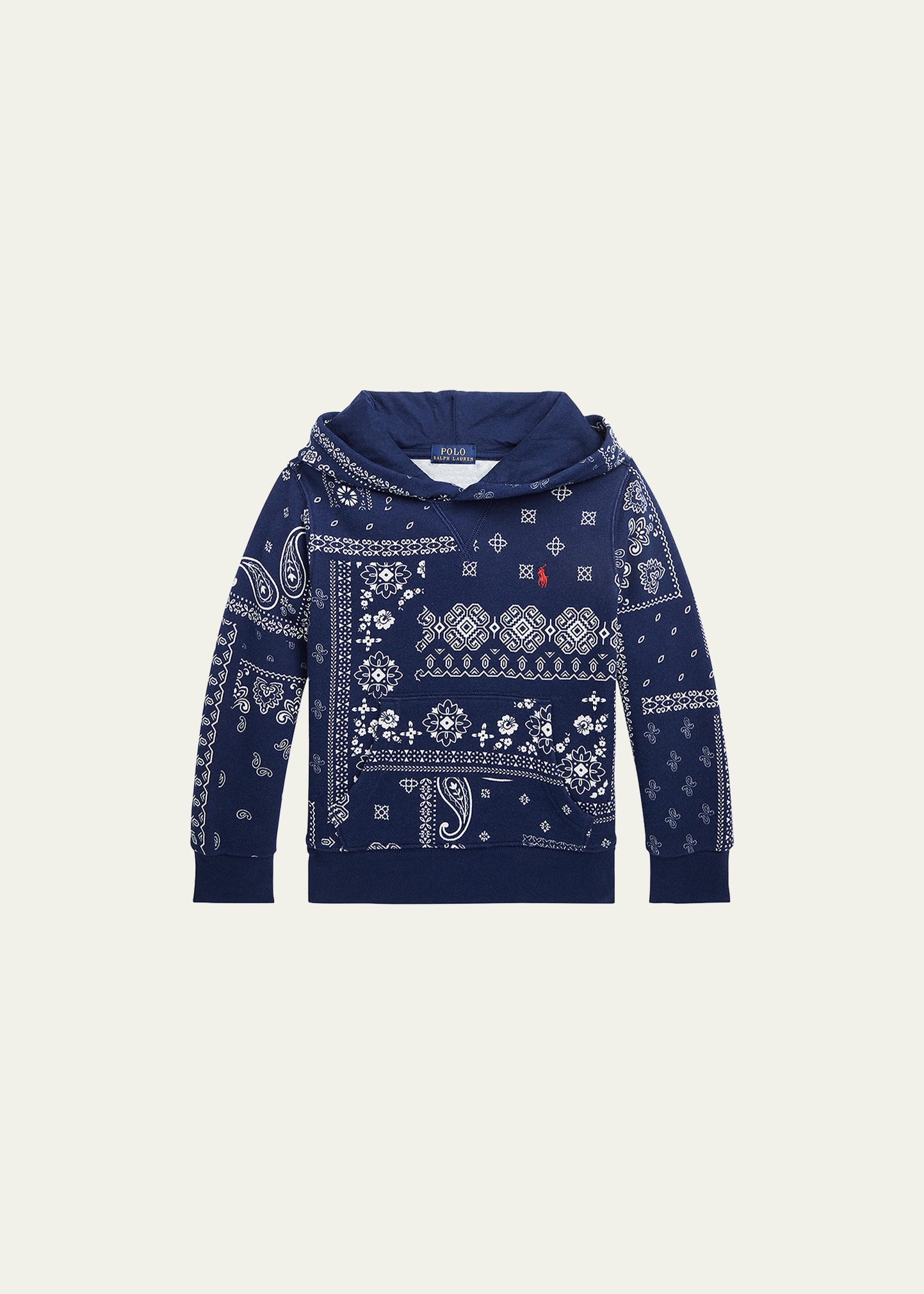 Ralph Lauren Childrenswear hoodie in bandana-print with contrast embroidered pony at chest Hooded neckline Long sleeves Kangaroo pocket Banded cuffs and hem Pullover style Machine washable Cotton/polyester Imported