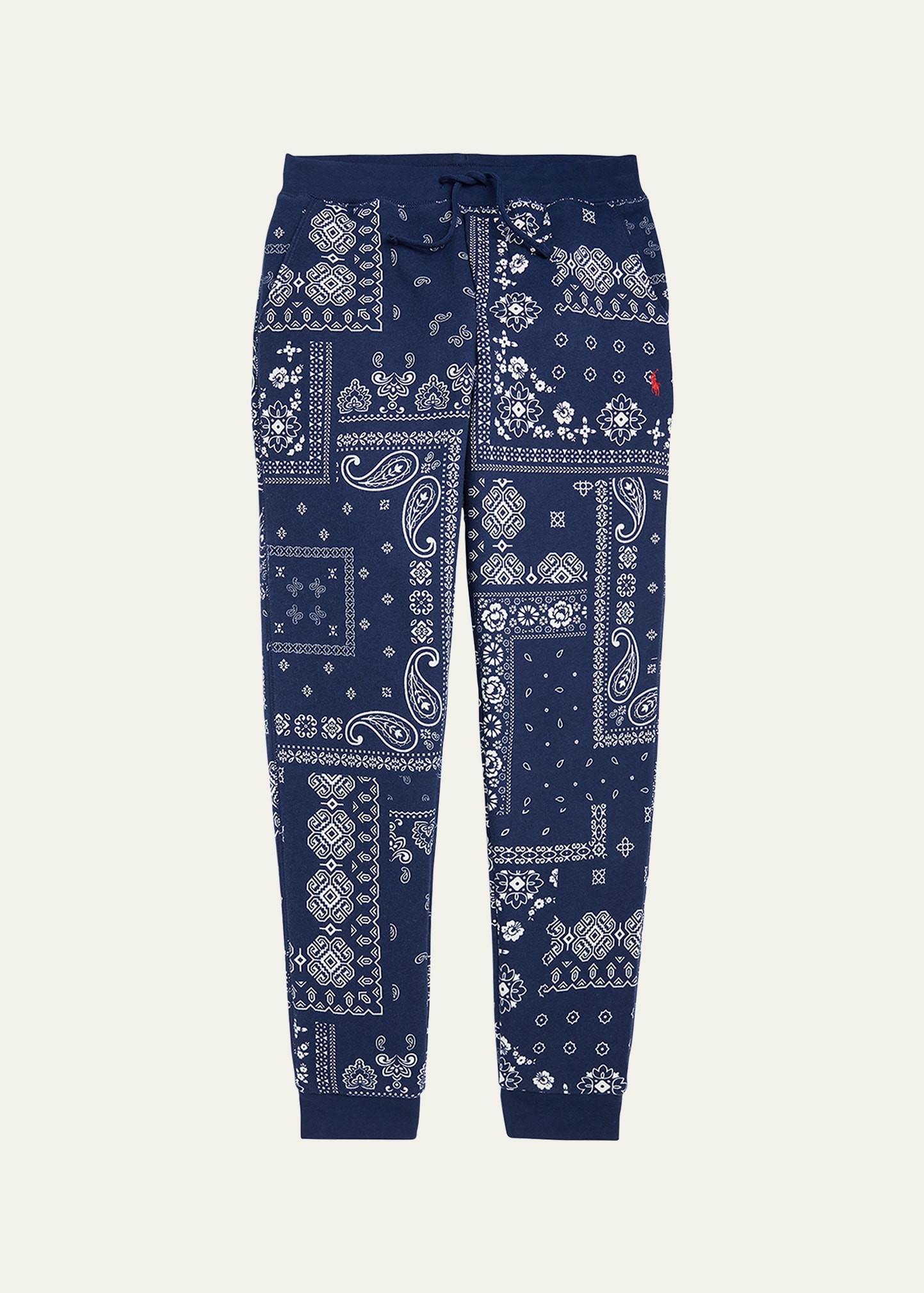 Ralph Lauren Childrenswear bandana-print fleece jogger pants with signature contrast embroidered pony at front Elasticized drawstring waistband Side slip pockets Slip pocket at back Cropped at ankles Relaxed fit Machine washable Cotton/polyester Imported