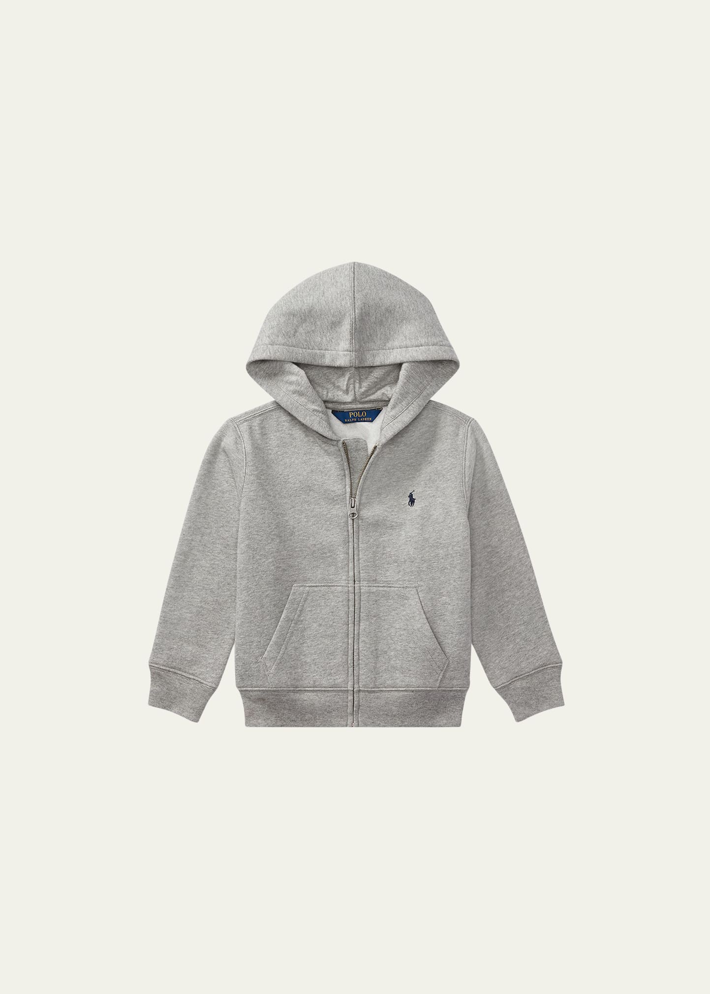 Ralph Lauren Childrenswear fleece hoodie with signature embroidered pony. Hooded collar; zip front. Long sleeves. Split kangaroo pockets. Ribbed cuffs and hem. Cotton/polyester. Machine wash. Imported.