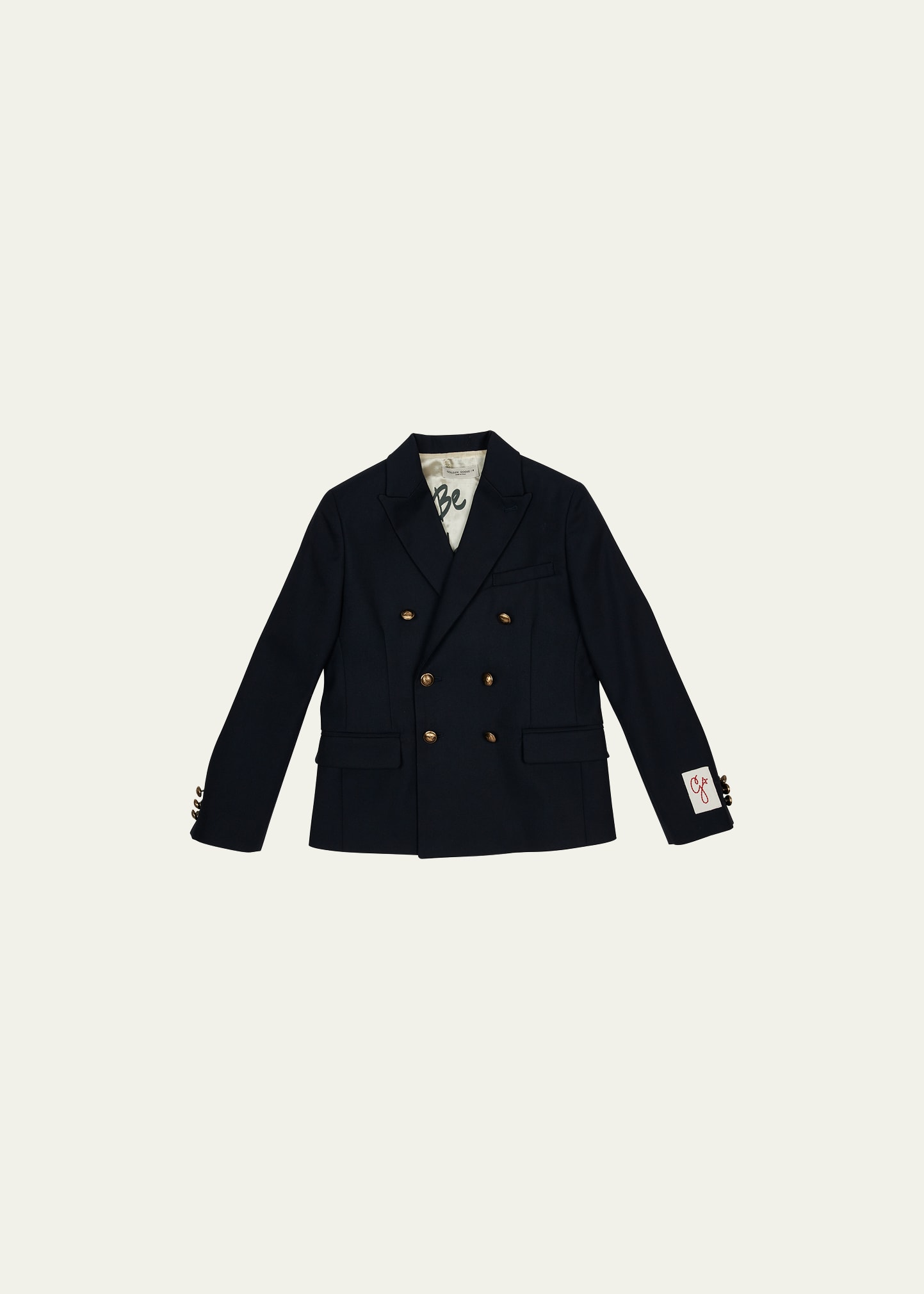 Golden Goose virgin wool blazer with signature logo patch at sleeve Notch collar Long sleeves Double-breasted front Button cuffs Straight hem Polyester/virgin wool Made in Italy