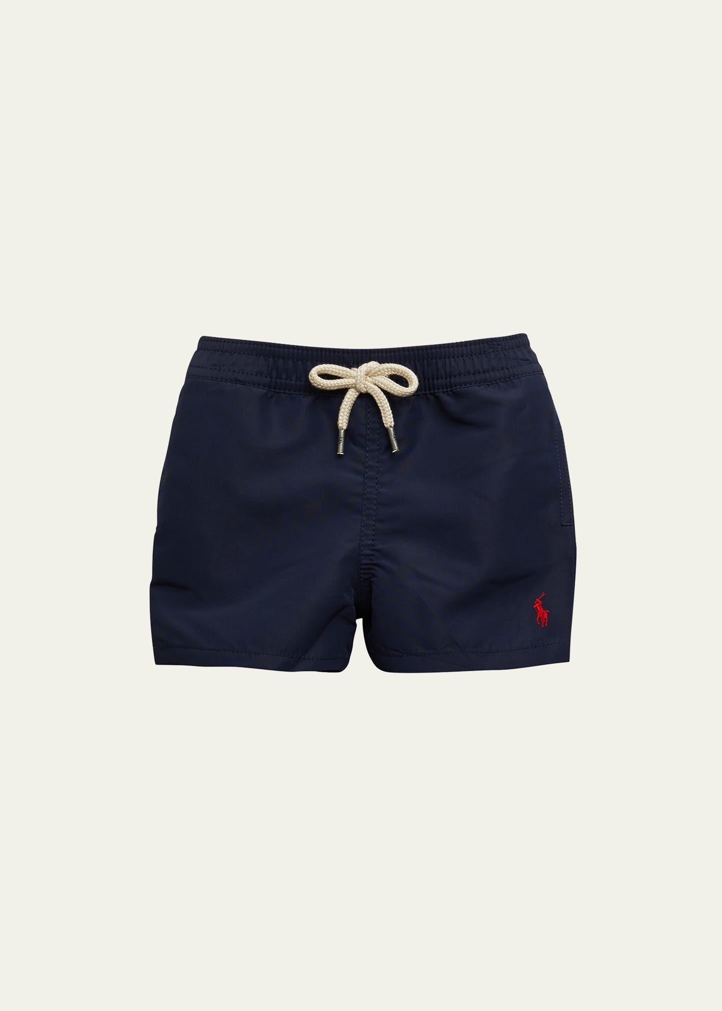 Ralph Lauren Childrenswear swim trunks embroidered with signature pony Elasticized drawstring waistband Slip pockets Flap pocket Mesh lined Machine washable Recycled polyester Imported