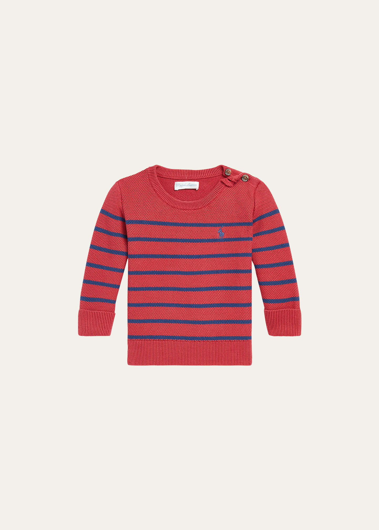Ralph Lauren Childrenswear striped mesh-knit sweater with signature envriudered pony at chest Crew neckline Long sleeves Button closures at shoulder Folded cuffs Ribbed trim Pullover style Cotton Imported