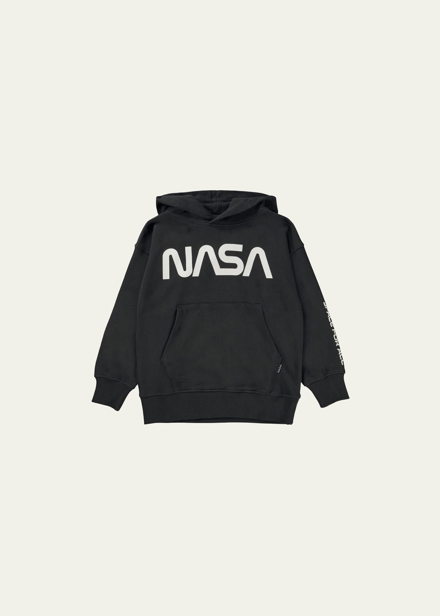 Molo "Moz" hoodie with NASA logo at front Hooded neckline Long sleeves Kangaroo pocket Banded cuffs and hem Pullover style This product is gots certified organic by ecocert greenlife, certification no. 197496 Organic cotton Imported