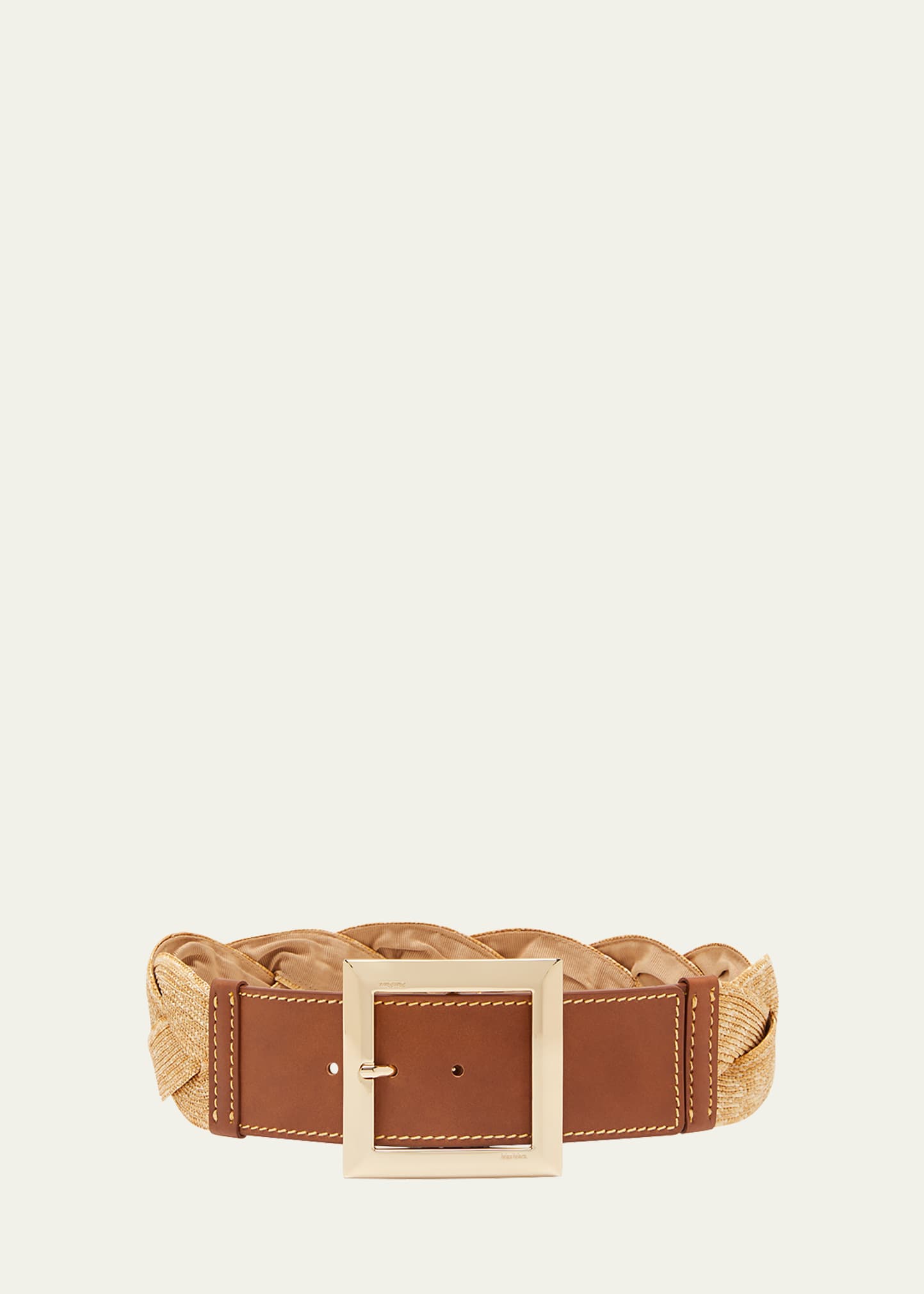 Max Mara wide braided belt in raffia straw, polyester, and velvet (polyester) Contrasting stitch accents Oversized square buckle; engraved logo Adjustable fit Made in Italy
