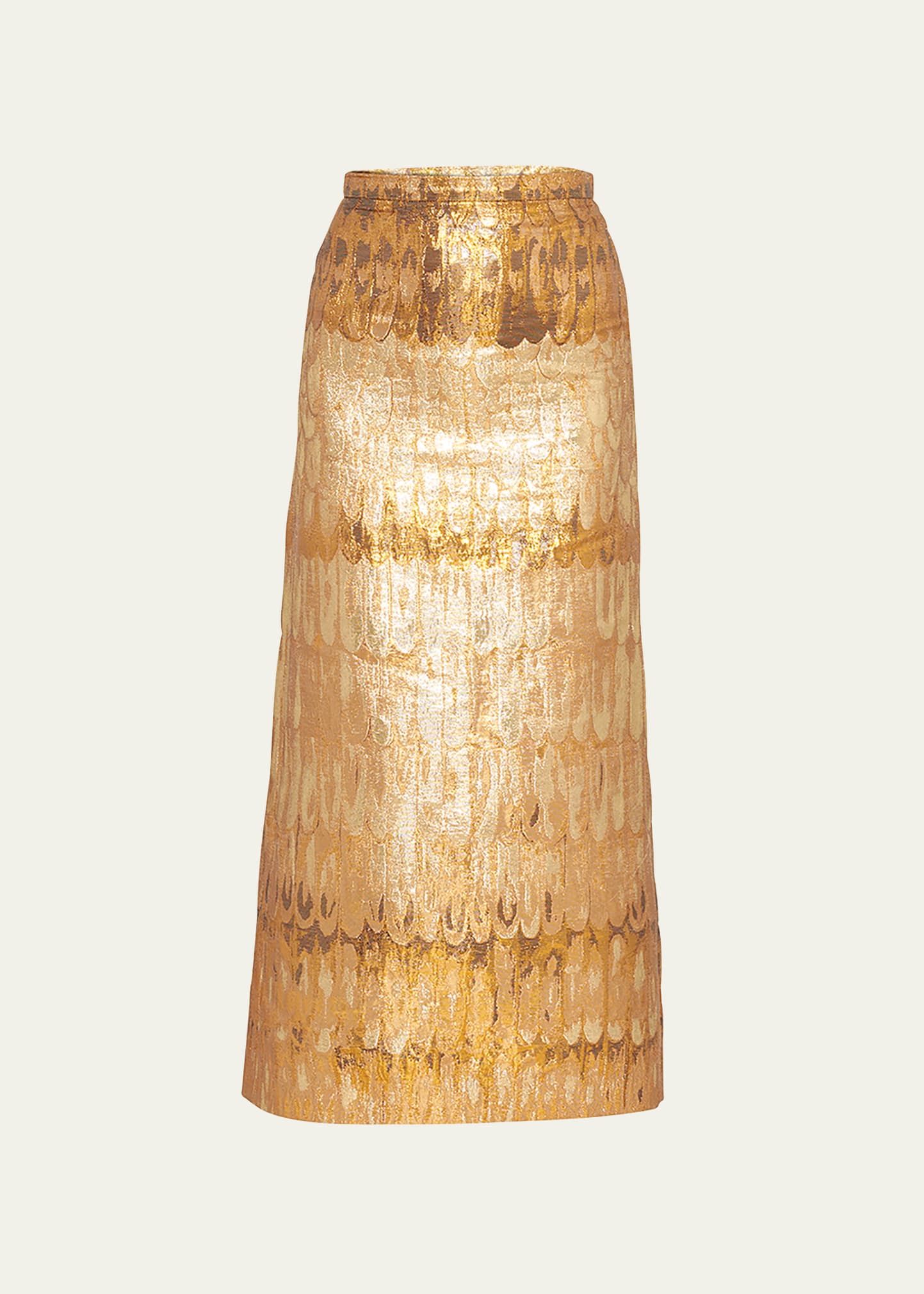 Valentino Broccato maxi skirt with golden wing details throughout and a metallic finish High rise; band waist Full length Back center slit Straight fit Polyester/metallic fabric/silk Made in Italy