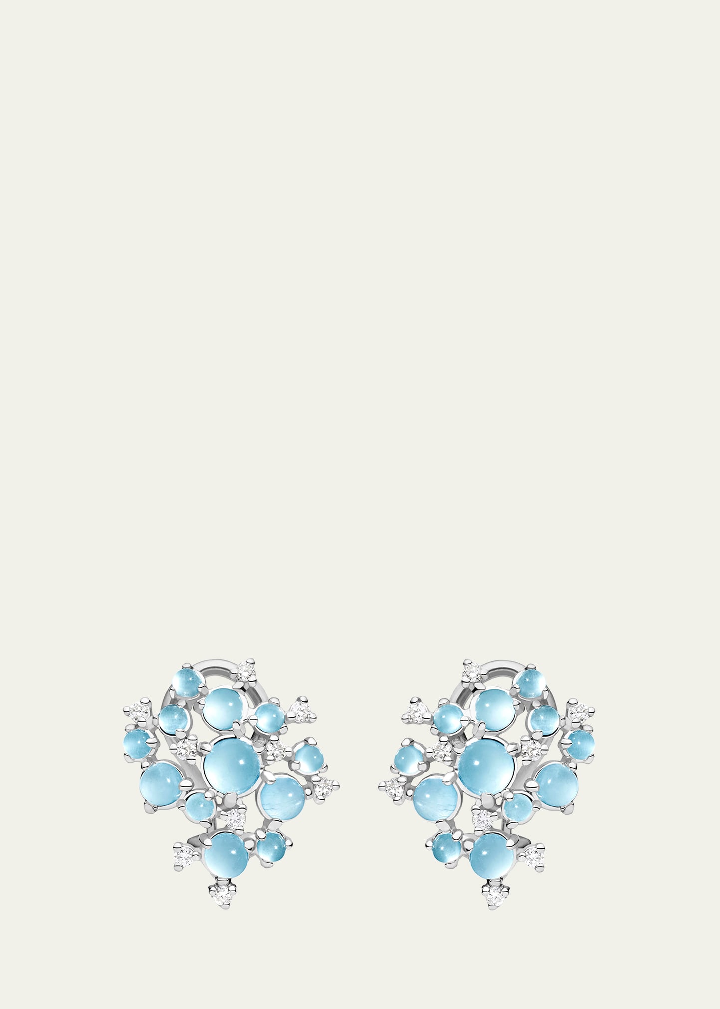 Paul Morelli "Bubble" earrings 18-karat white gold Round aquamarine cabochons Scattered white diamond accents 2.12 total moonstone carat weight 0.25 total diamond carat weight Clip-on backs
