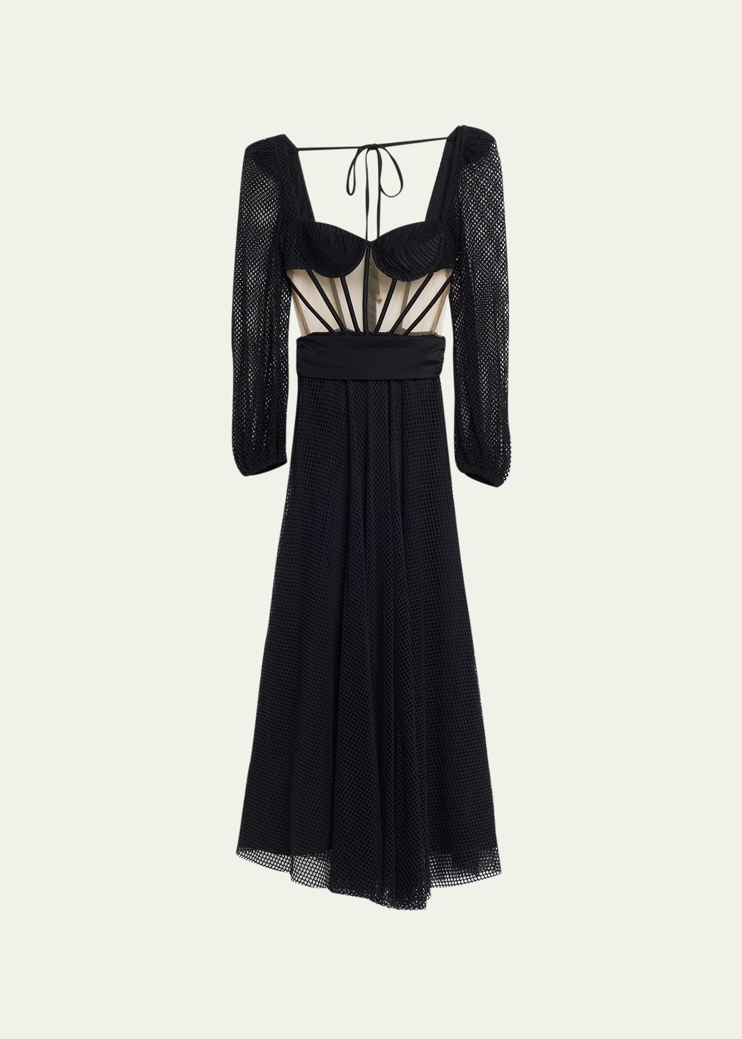PatBO netted bustier dress Sweetheart neckline Strong shoulders Long blouson sleeves; elastic cuffs Full length A-line silhouette Self-ties behind the neck Center back zip Cotton/modal Made in Brazil