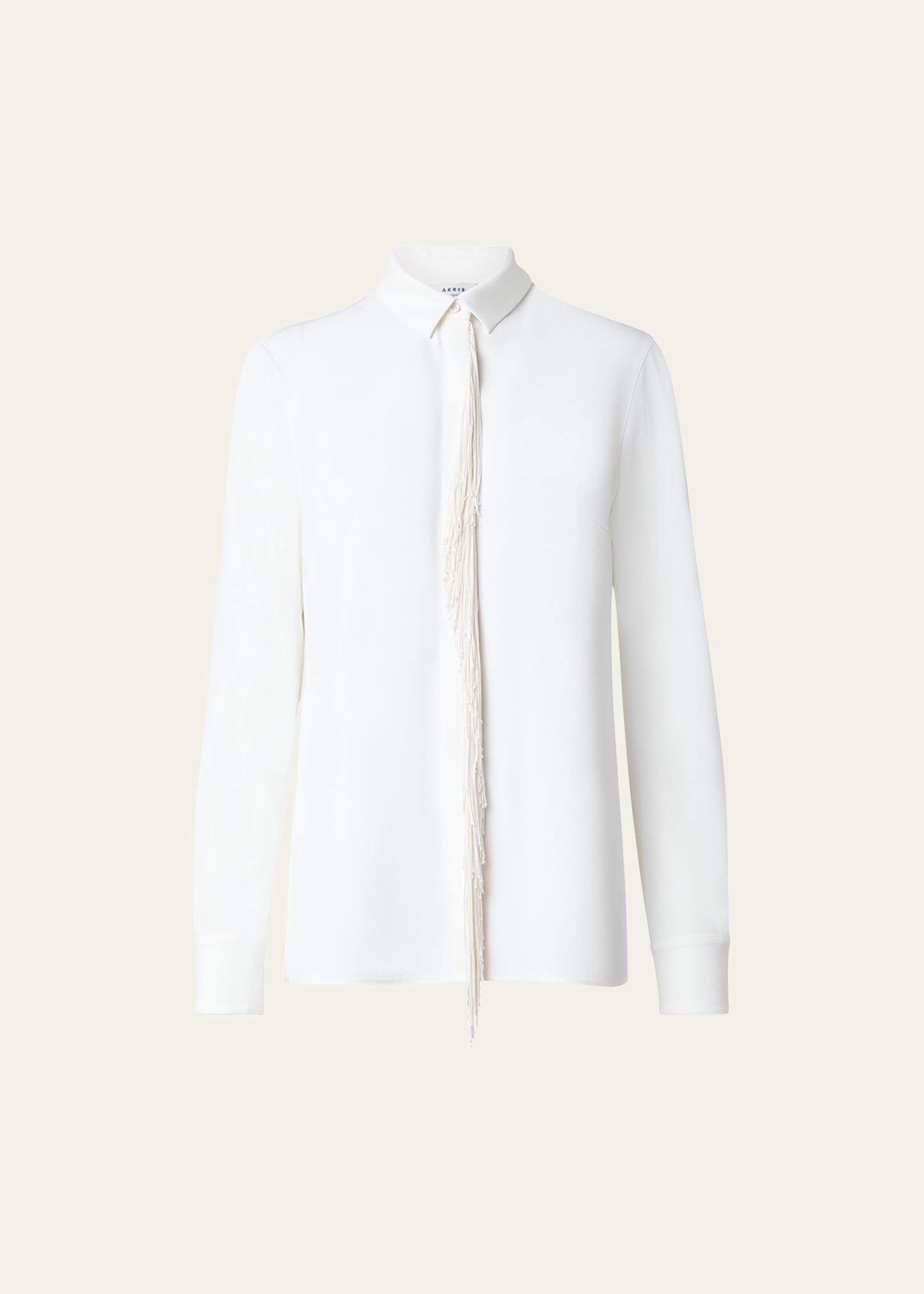 Akris punto blouse features fringe detailing at the front placket Kent collar Concealed button front closure Long sleeves Back yoke; pleated Hip-length Straight fit Polyester/polyurethane Made in Romania