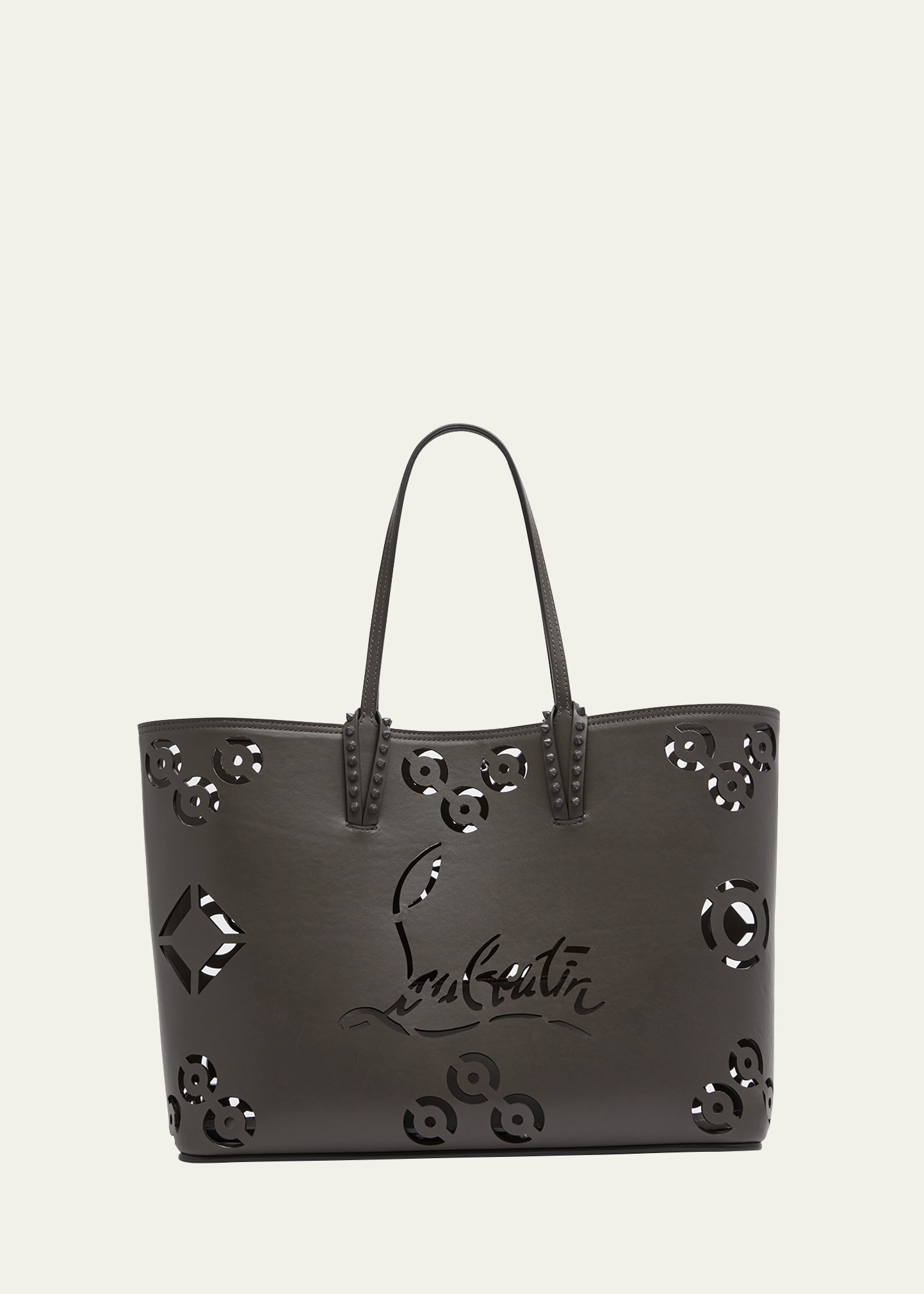 Christian Louboutin "Caba" tote bag in perforated logo leather Flat shoulder straps with spike trim Open top with lobster clasp closure Interior, leashed zip pouch bag Approx. 11.8"H x 15.3"W x 5.5"D Made in Italy