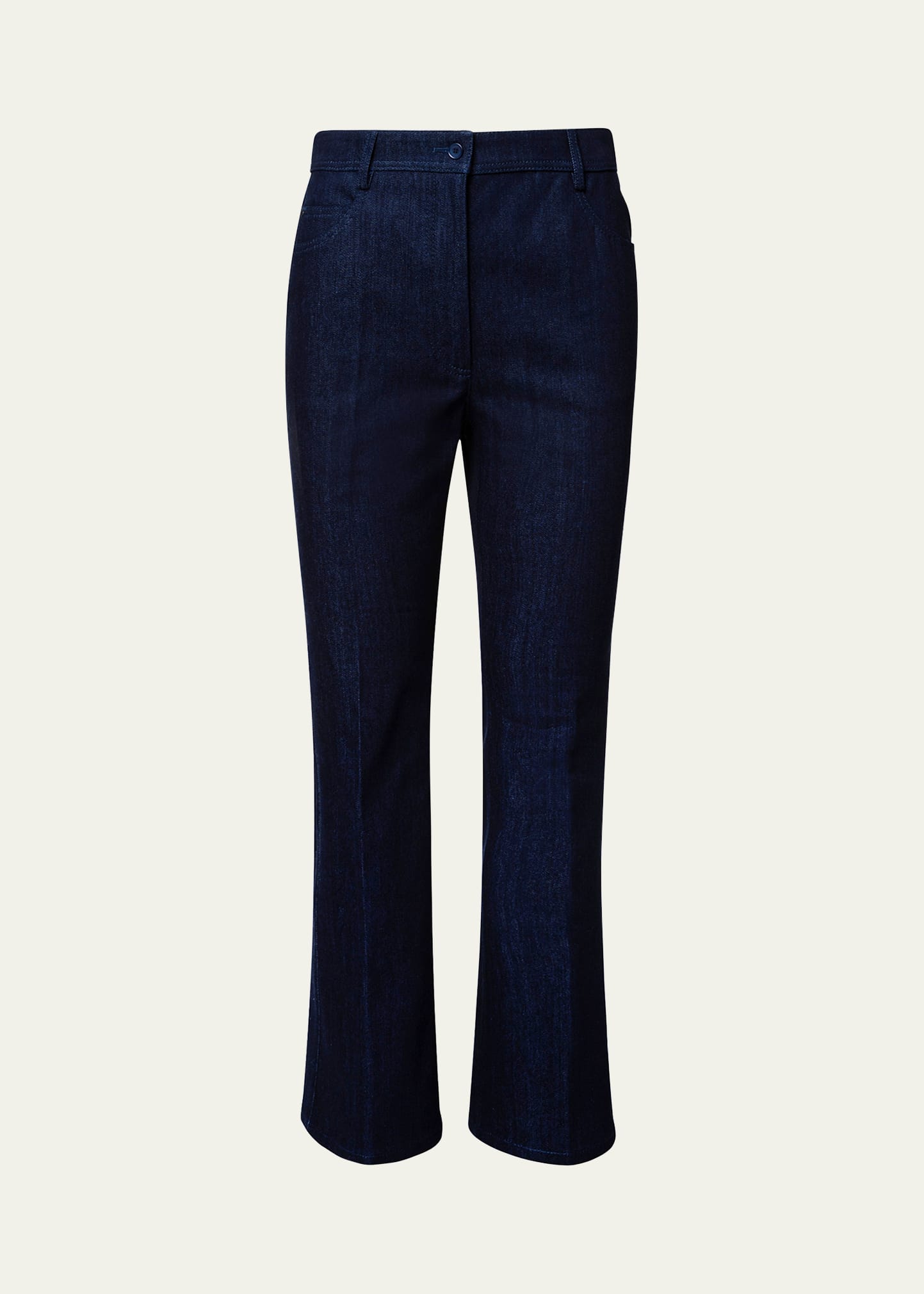 Akris punto "Cali" pants in denim Mid-rise Button/zip fly; belt loops Five-pocket style; logo patch at back Bootcut silhouette Cropped fit Cotton/spandex Lining: Cupro Made in Romania
