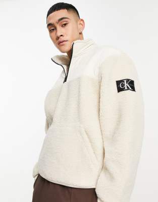 Calvin Klein Jeans badge logo sherpa borg half zip sweatshirt in off-white-Neutral