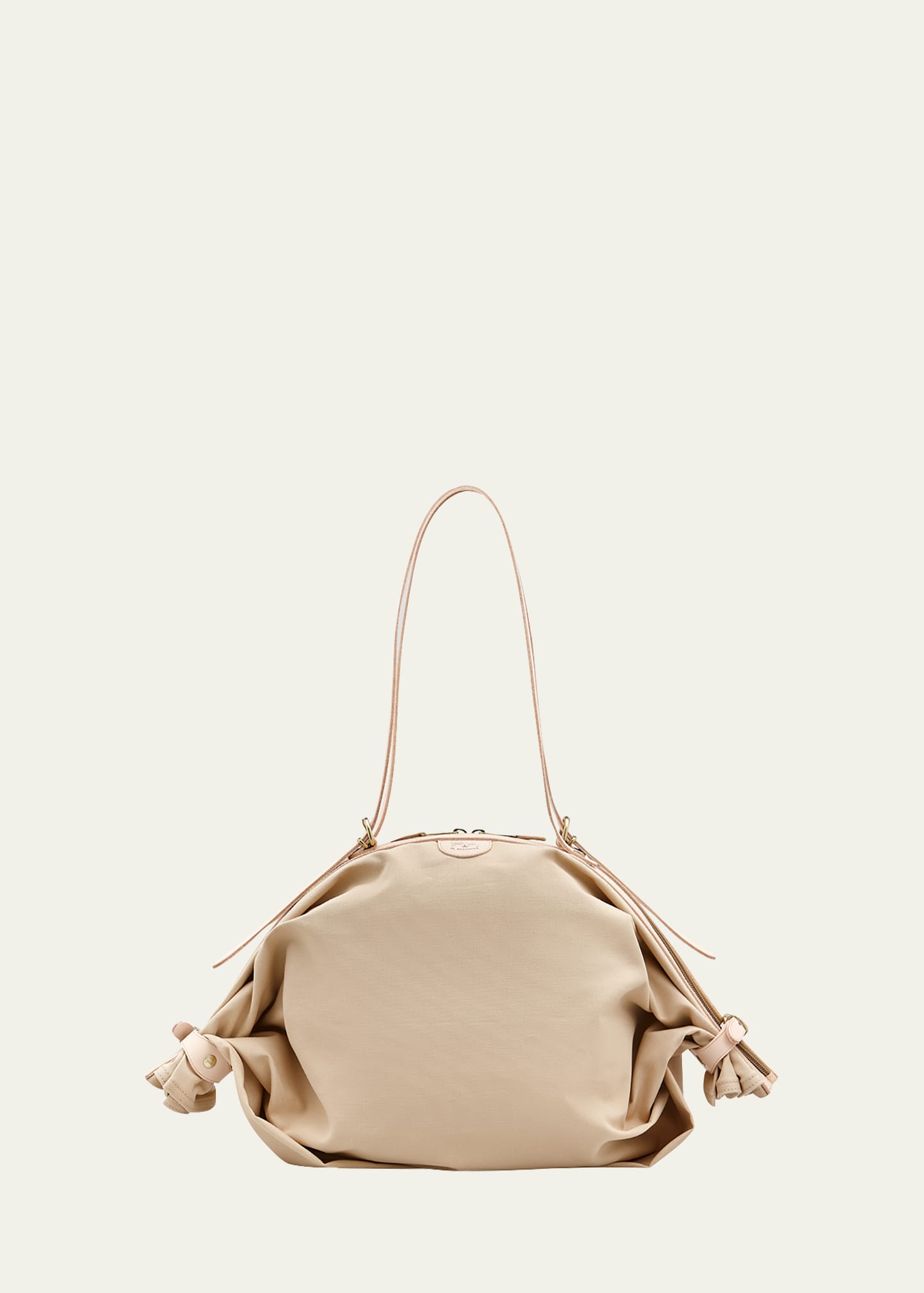 Il Bisonte "Caramella" foldable tote bag in cotton and Vachetta leather Adjustable buckle shoulder straps, 11.9" drop Two-way zip top closure Lining: Unlined Approx. 18.5"H x 26.8"W x 2.4"D Item Weight (Lbs.): 1.4 Made in Italy