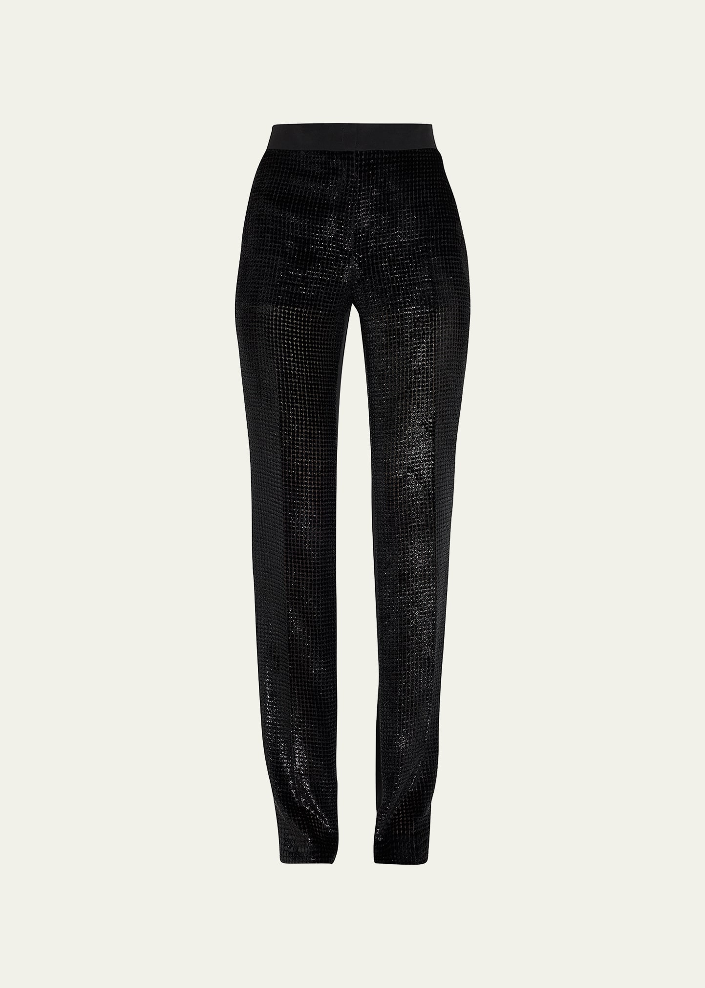 Akris "Carl" pants featuring grid devoré High rise Flat front Side zip pockets Straight legs Full length Tab/zip fly Viscose/silk/nylon Viscose lining Dry clean Made in Romania