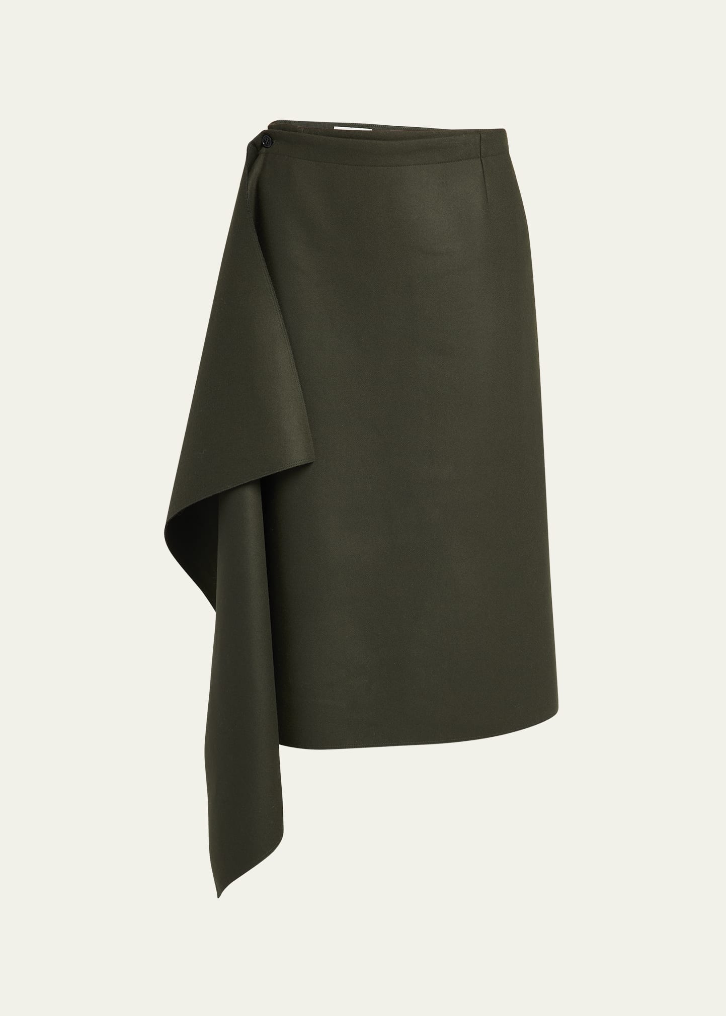 Moncler midi skirt features a draped asymmetric ruffle at front Mid-rise Concealed side zip closure Hem falls below the knee Skirt falls straight from hip to hem Virgin wool/cashmere Unlined Hand wash or dry clean Made in Hungary