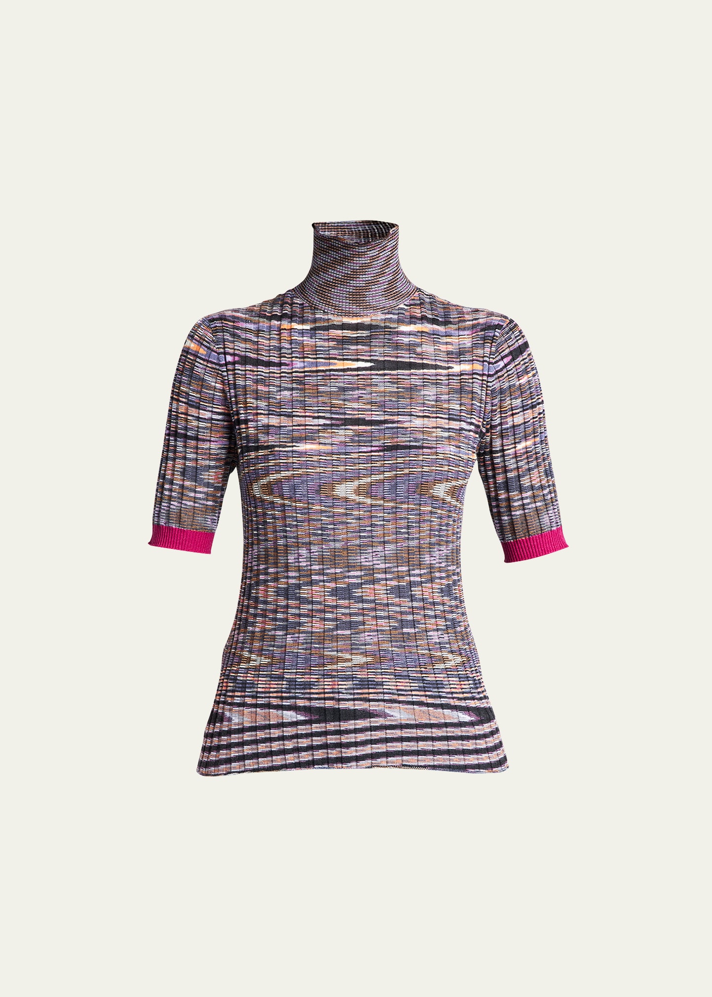 Missoni knit sweater top features a roll-down turtleneck Elbow sleeves; ribbed cuffs Hip-length Fitted Pullover style Cashmere/silk Made in Italy