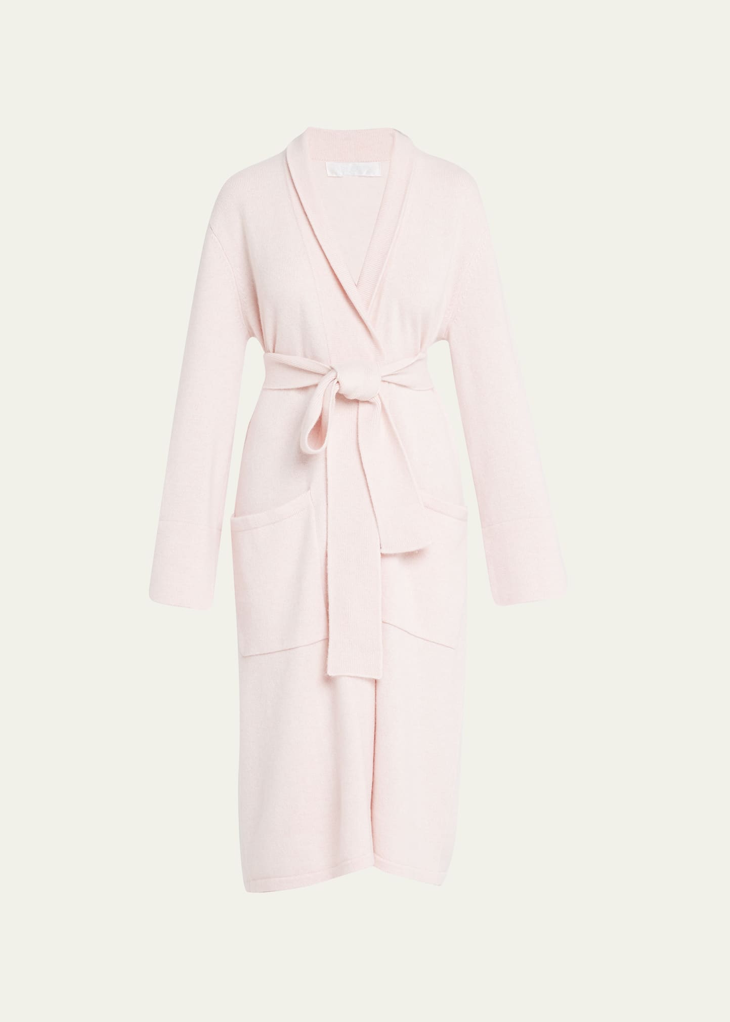 Arlotta Cashmere robe crafted from cashmere with a matching self-tie belt Shawl collar; wrap front Long sleeves Drop shoulders Front patch pockets Hem falls below the knee Relaxed fit Cashmere Imported