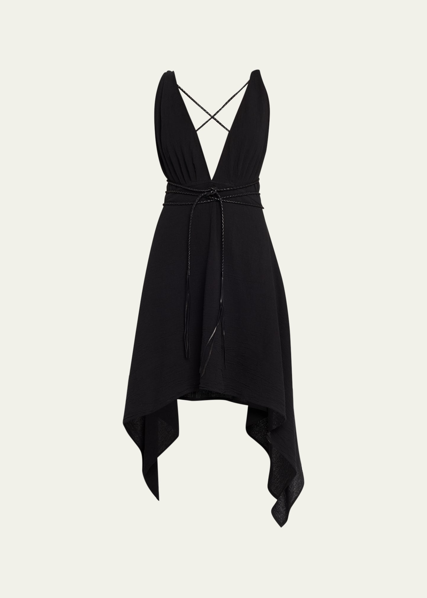 CARAVANA "Charki" midi dress featuring a plunging V neckline and crisscross back Sleeveless A-line silhouette Handkerchief hem Back tie closure Cotton/leather Imported