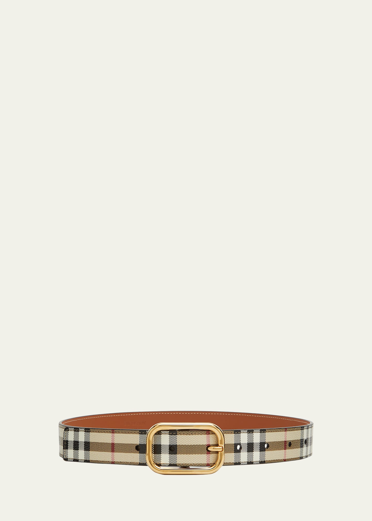 Burberry belt in dyed calf leather, polyurethane, polyester, cotton, and acrylic Golden round frame buckle Adjustable fit May be styled in multiple ways Made in Italy