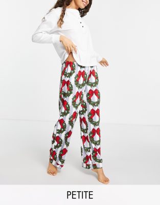 Chelsea Peers Petite Christmas wreath long pajamas with henley top in blue and white-Navy