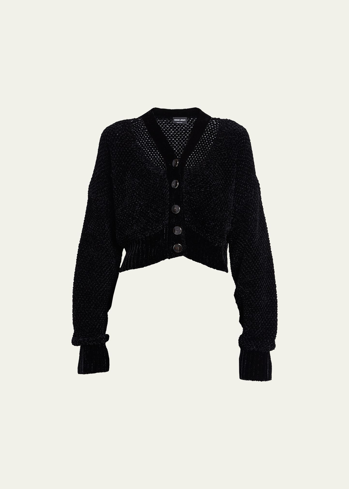 Giorgio Armani chenille cardigan features chest cutouts V neckline; button front Dropped shoulders Long sleeves Cropped length Ribbed cuffs and hem Viscose/nylon/polyamide/cotton Dry clean Made in Italy