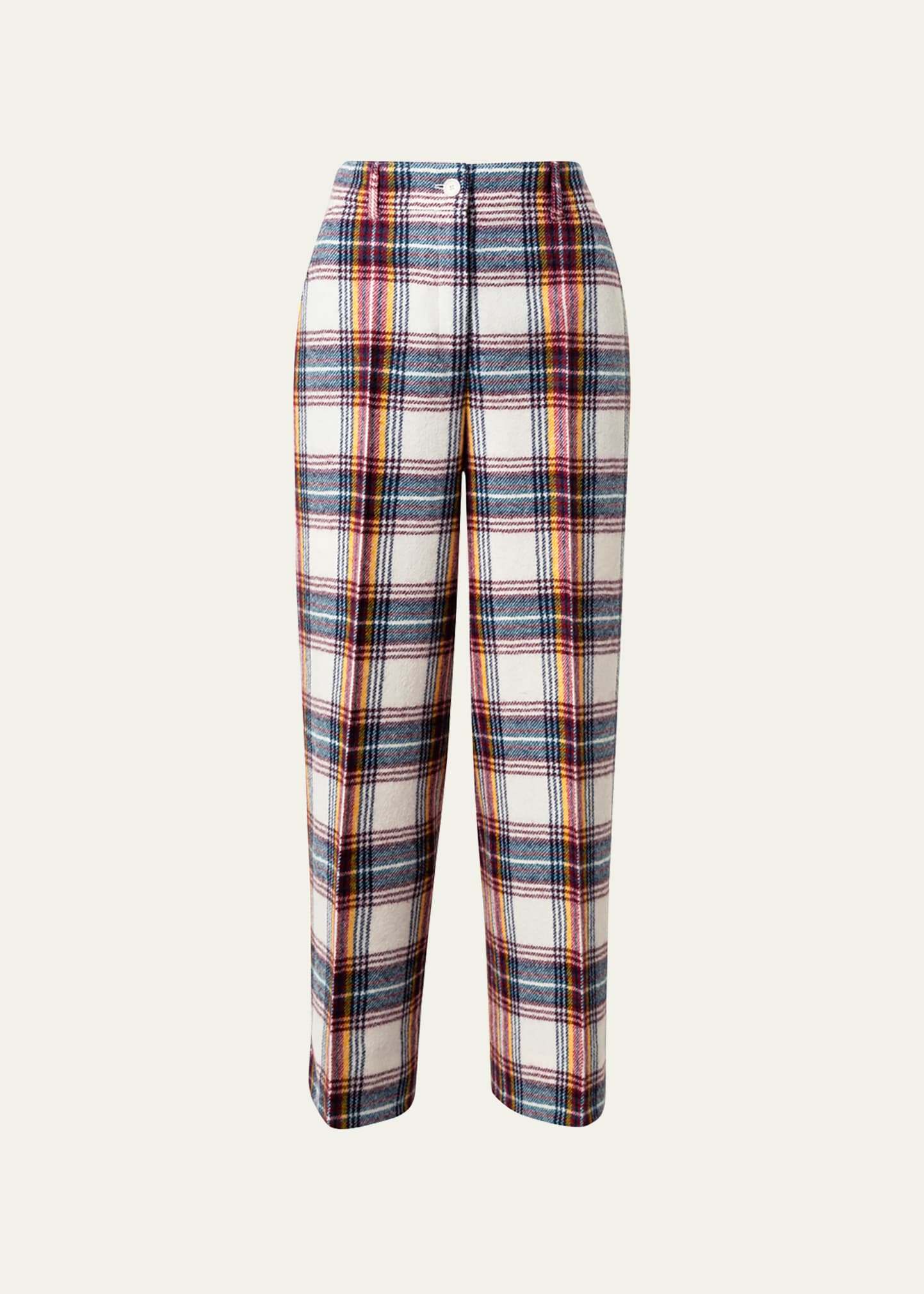 Akris punto "Chiara" flannel pants in tartan check Mid rise Side slash pockets Wide legs Cropped at ankle Button/zip fly; belt loops Virgin wool Made in Romania
