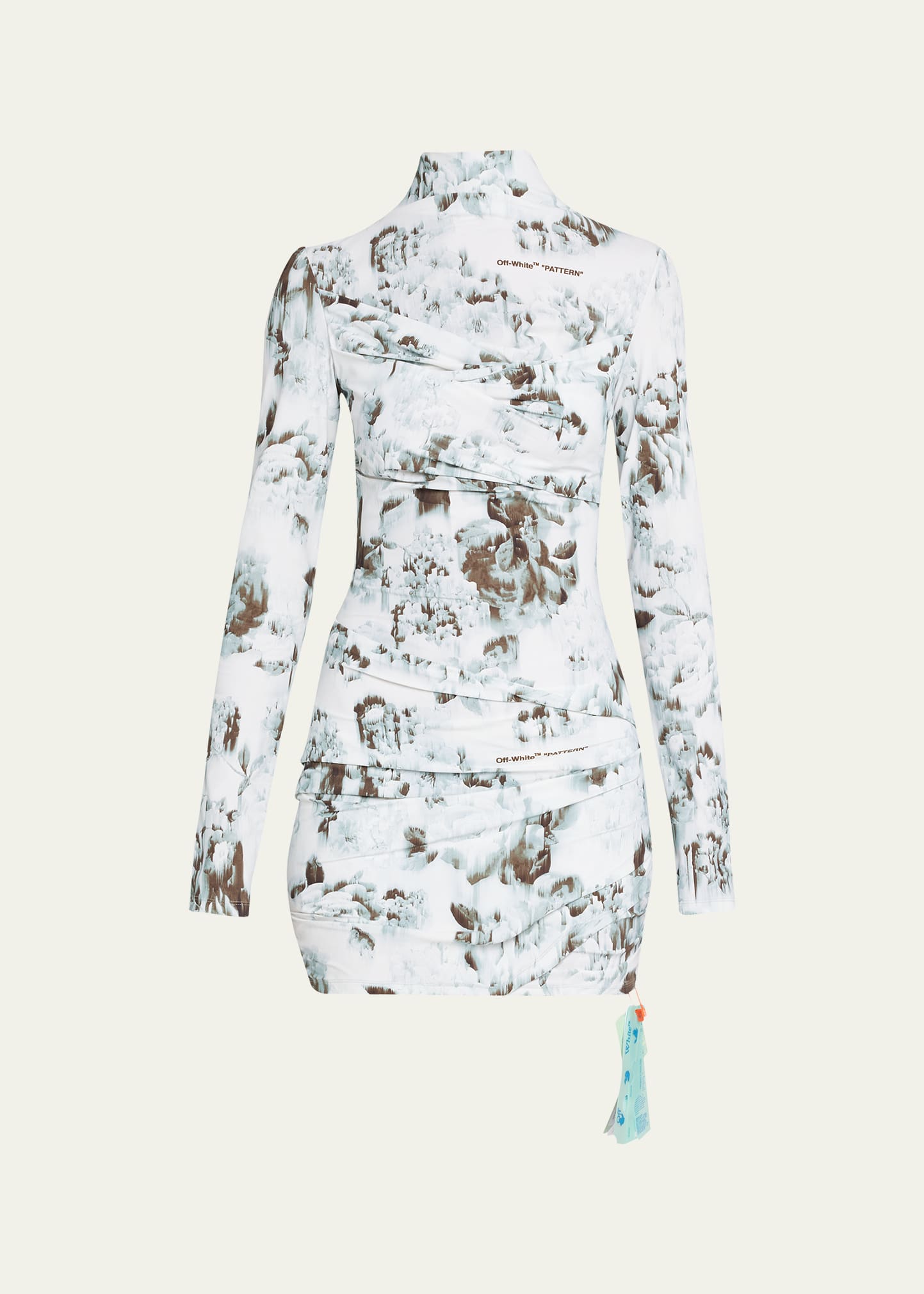 Off-White chine second skin twist-front mini dress in an all-over dyed floral print Turtleneck Long sleeves Signature logo tags at hem Hem falls above the knee Bodycon fit Nylon/elastane Made in Italy