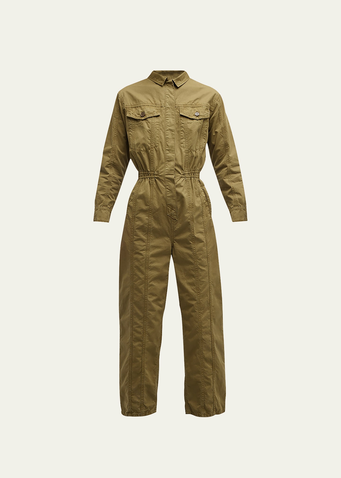 FRAME cinched jumpsuit with seamed detailing Point collar Long sleeves; button cuffs Chest flap pockets; back patch pockets Cinched waist Loose legs Cropped length Hidden button-front closure Cotton Dry clean Imported