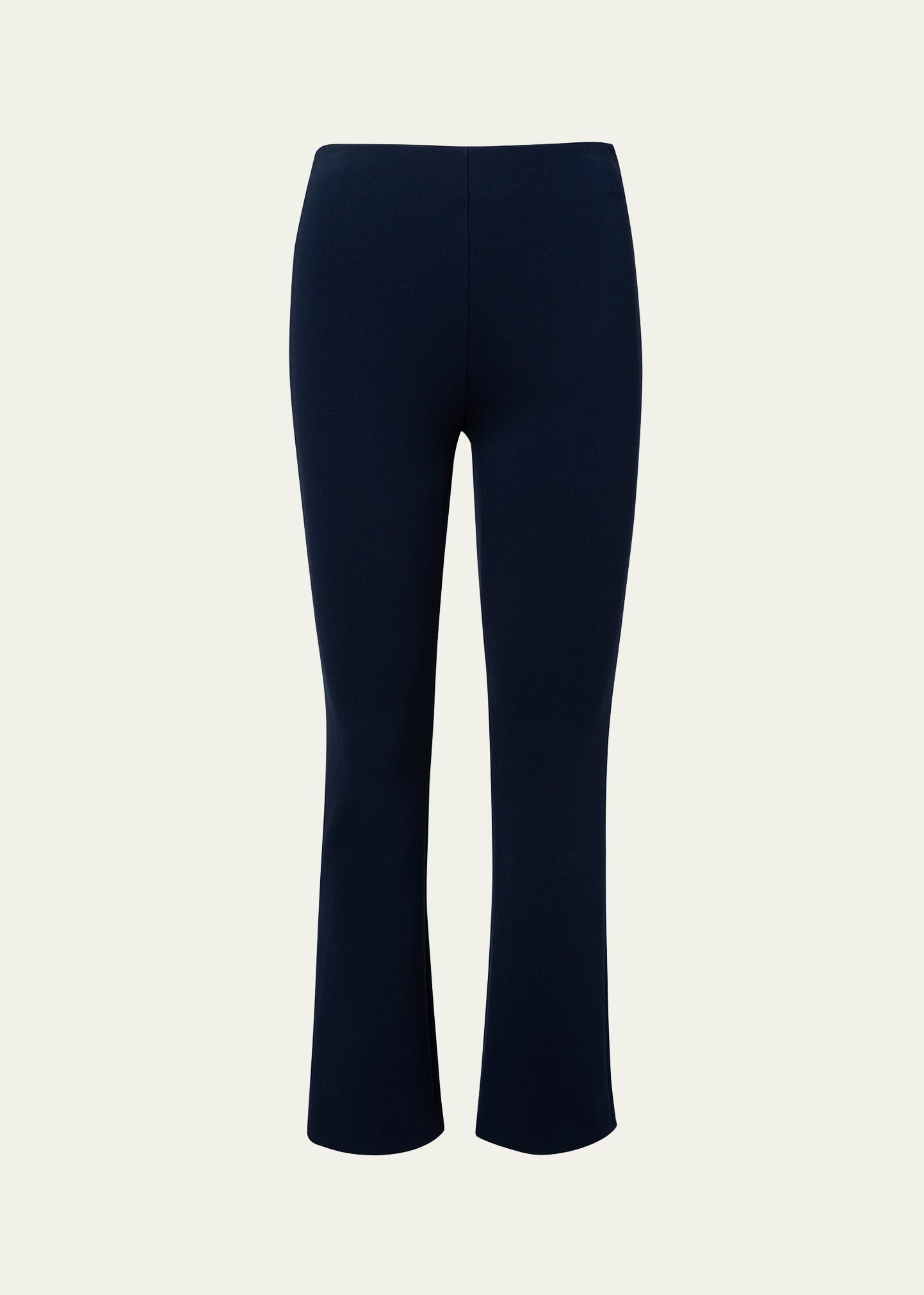 Akris punto "Cindy" signature jersey pants in a slight bootcut silhouette Mid-rise; elastic waistband Side zip closure Cropped fit Viscose/spandex Made in Romania