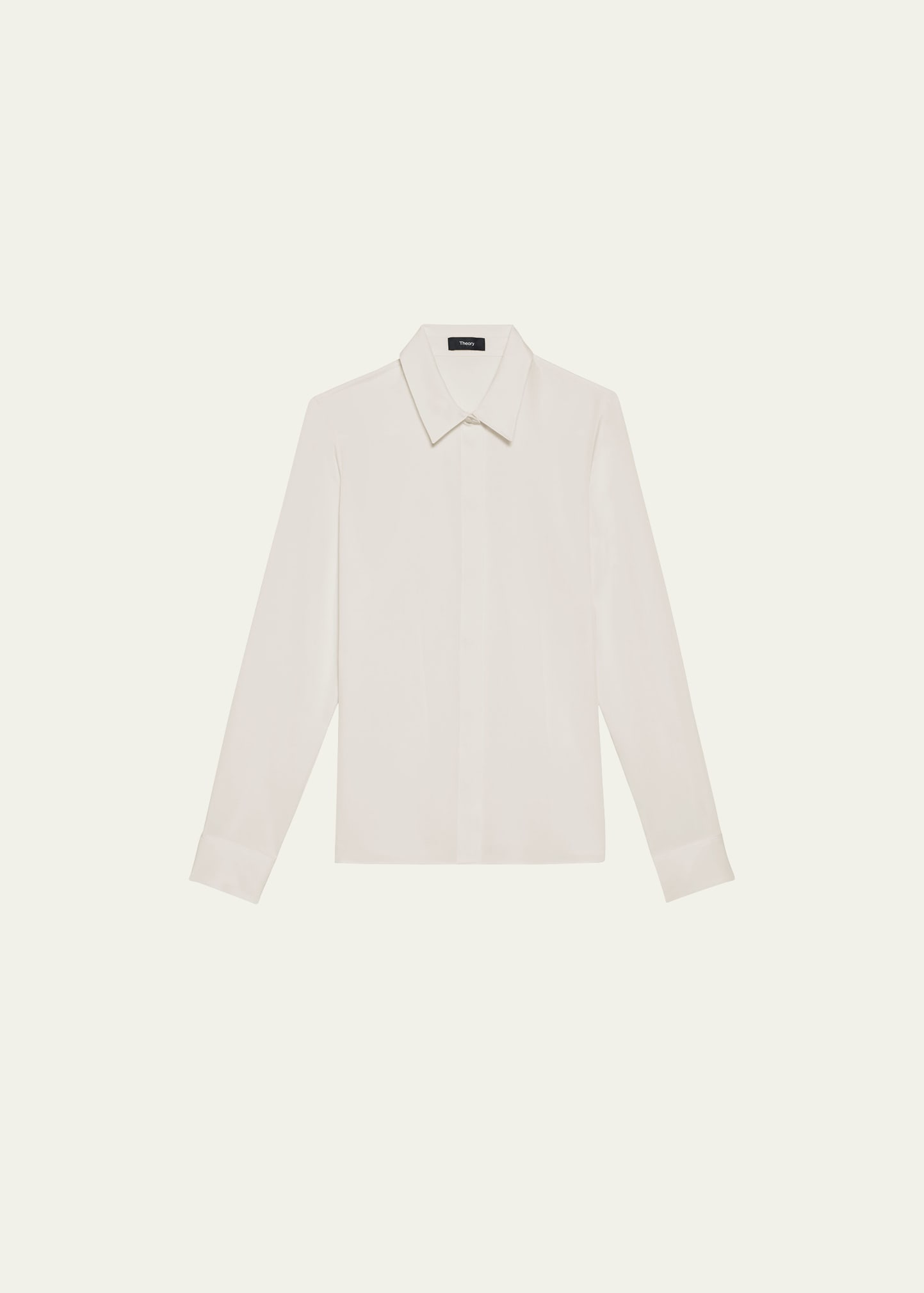 Theory silk shirt with back vertical darts Spread collar; hidden button front Long sleeves; button cuffs Back yoke Rounded hem Classic fit Silk Imported