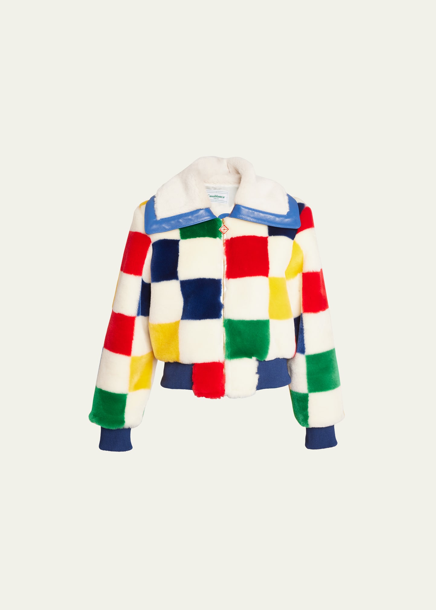 CASABLANCA faux fur (polyester) jacket in colorblock checkered pattern Spread collar; zip front Long sleeves Relaxed fit Ribbed cuffs and hem Polyester/cotton Dry clean Imported