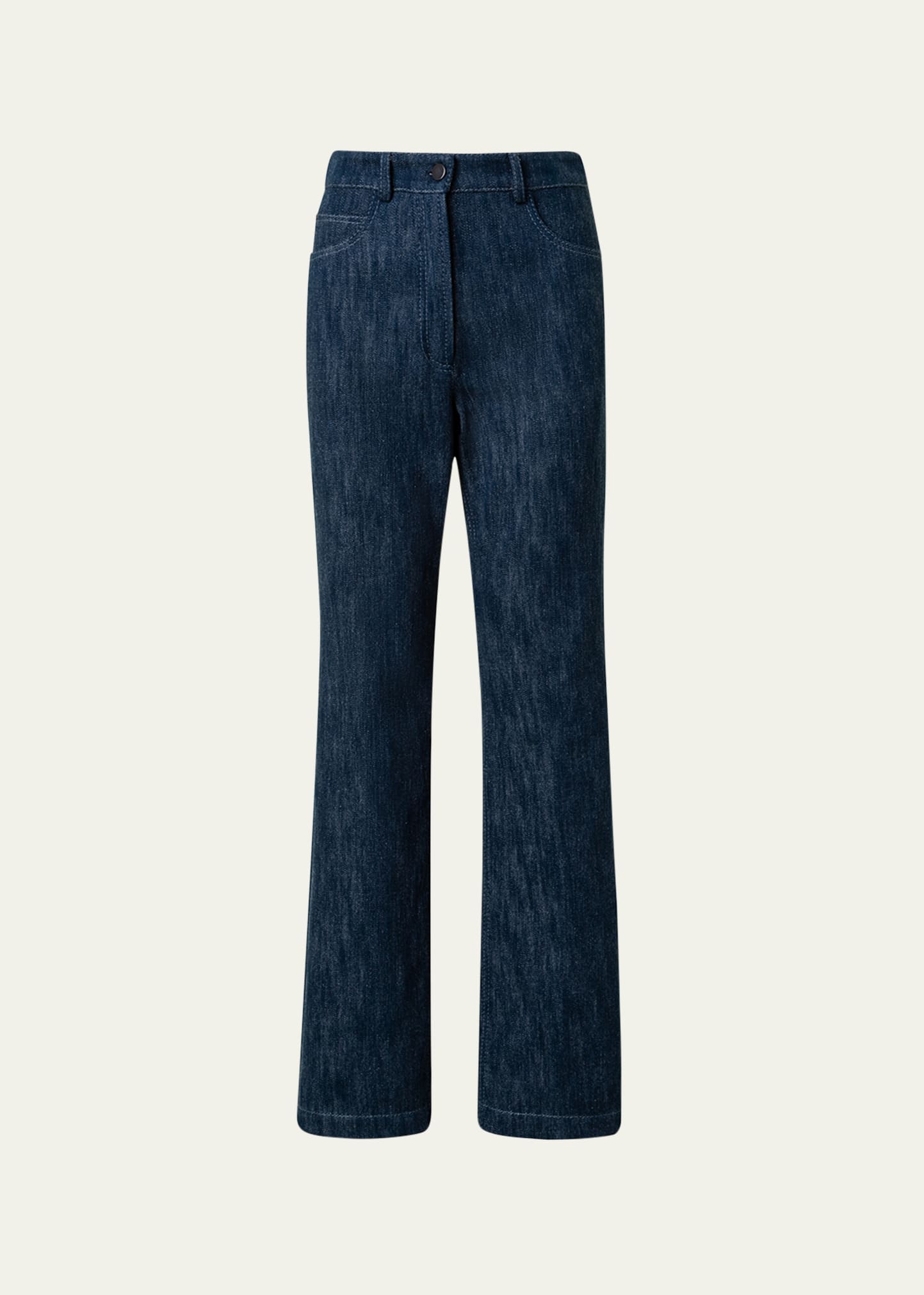 Akris punto "Conor" pants in a cotton denim finish feature a signature dot application at the back Mid-rise; sits high on hip Button/zip fly; belt loops Five-pocket style Straight legs Full length Cotton/wool/nylon/polyamide Made in Romania