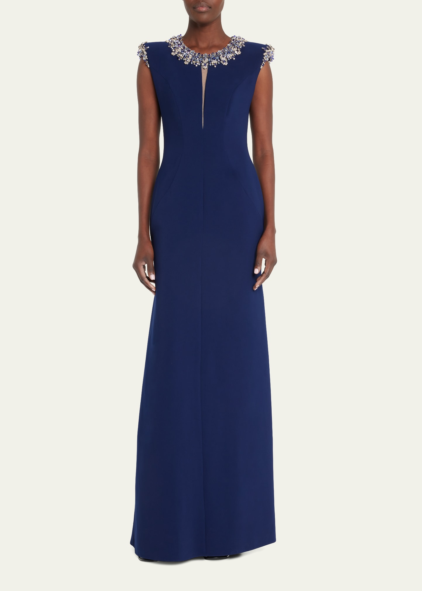 Jenny Packham "Cora" crepe gown with embellished trim Jewel neckline; mesh keyhole front Cap sleeves A-line silhouette Floor length Back zip Polyester/elastane Polyester lining Dry clean, professional cleaning recommended Imported
