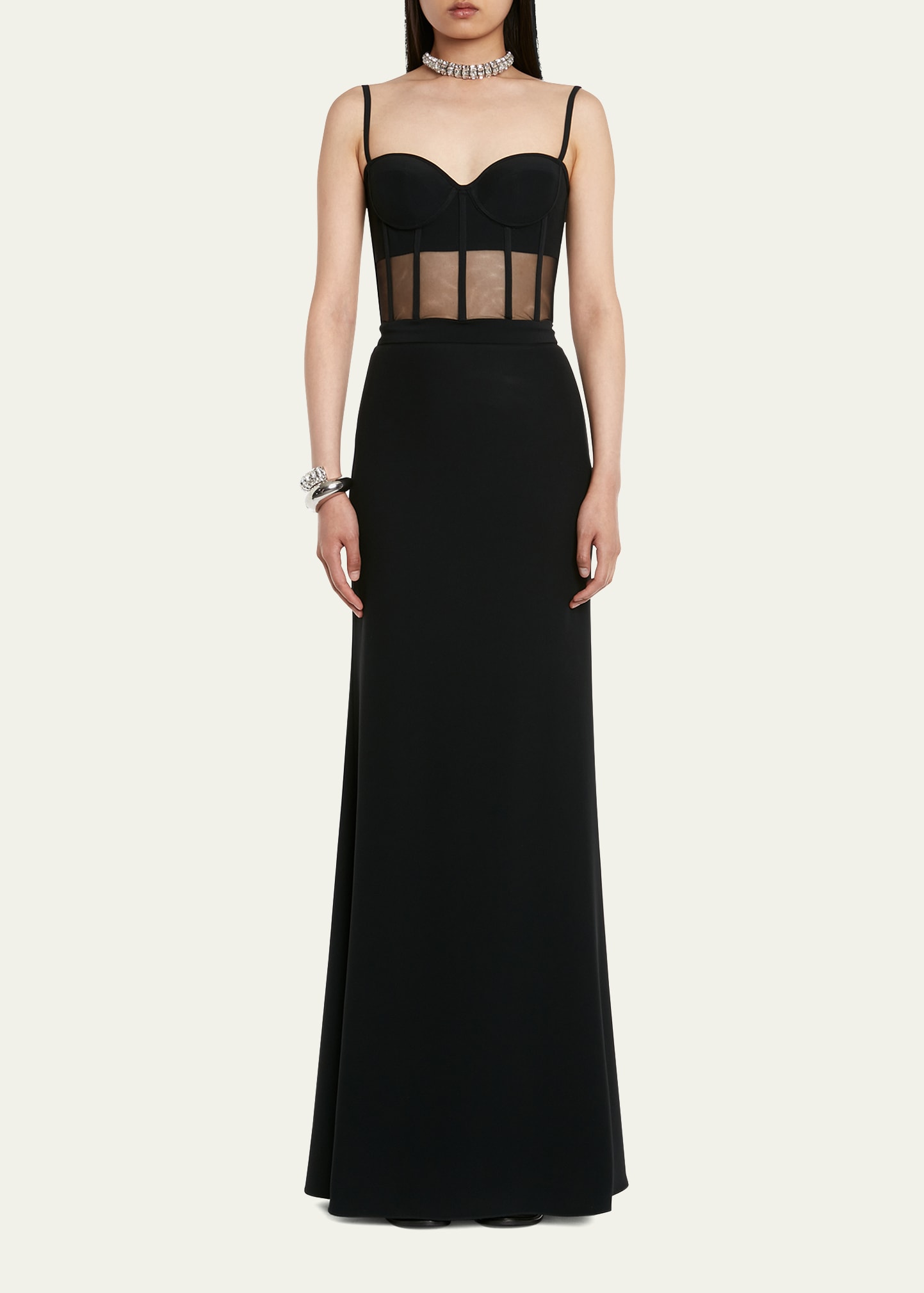 Alexander McQueen sustainable leaf crepe dress with a corset style bodice in a sheer finish Sweetheart neckline Sleeveless; spaghetti straps Back zip closure Full length Column silhouette Viscose/acetate/polyamide Made in Italy