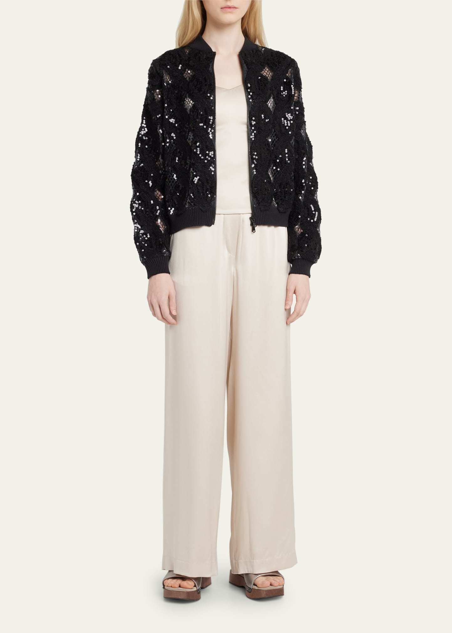 Brunello Cucinelli couture bomber jacket with an all-over cable knit styling with sequin embellishments throughout Band collar Two-way zip front Long sleeves Ribbed trim Hip length Relaxed fit Linen/silk/polyester Dry clean Made in Italy