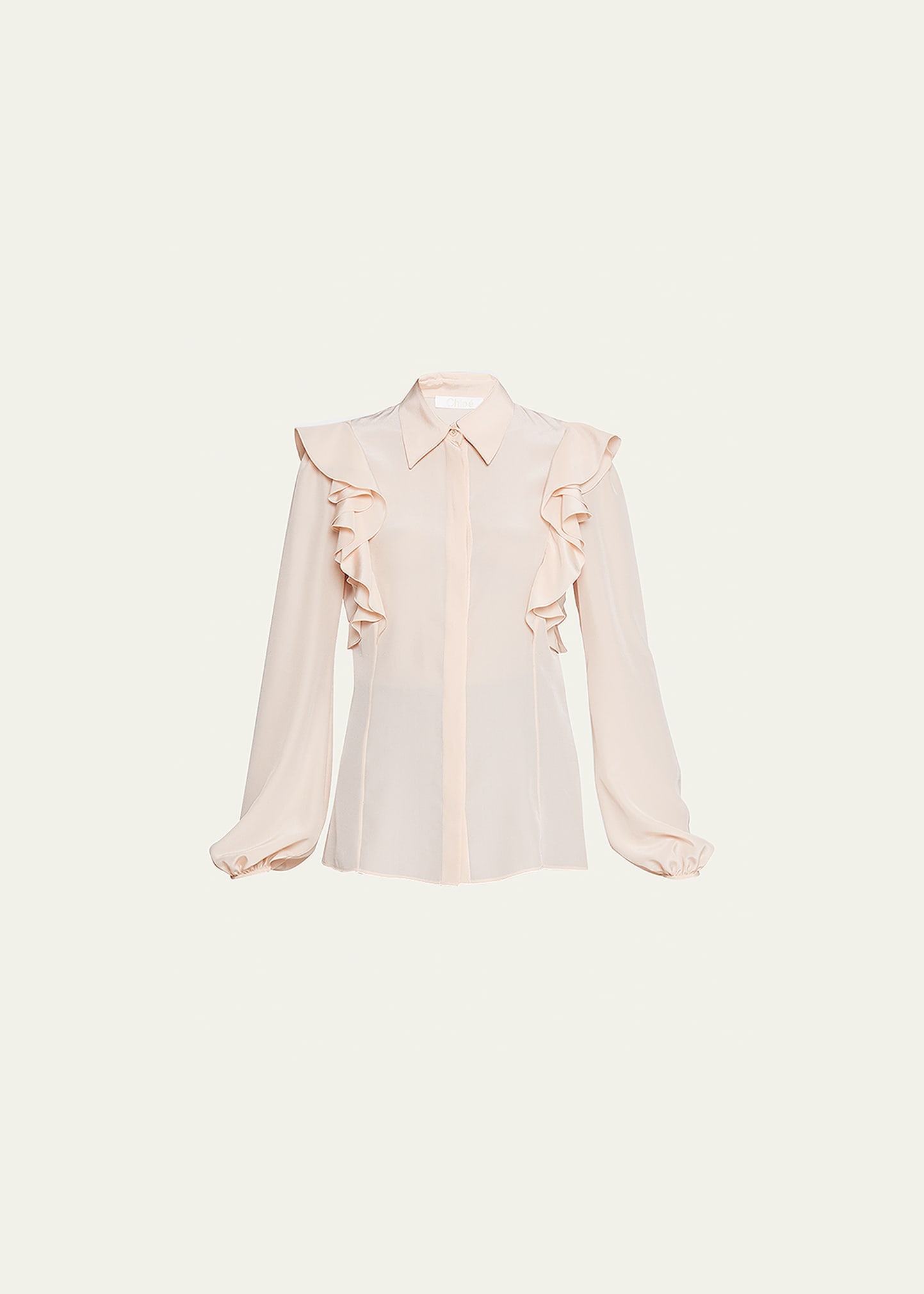 Chloe crepe button-down blouse with ruffled details at the shoulders Point collar Concealed button front Long sleeves Mid-length Relaxed fit Silk Imported