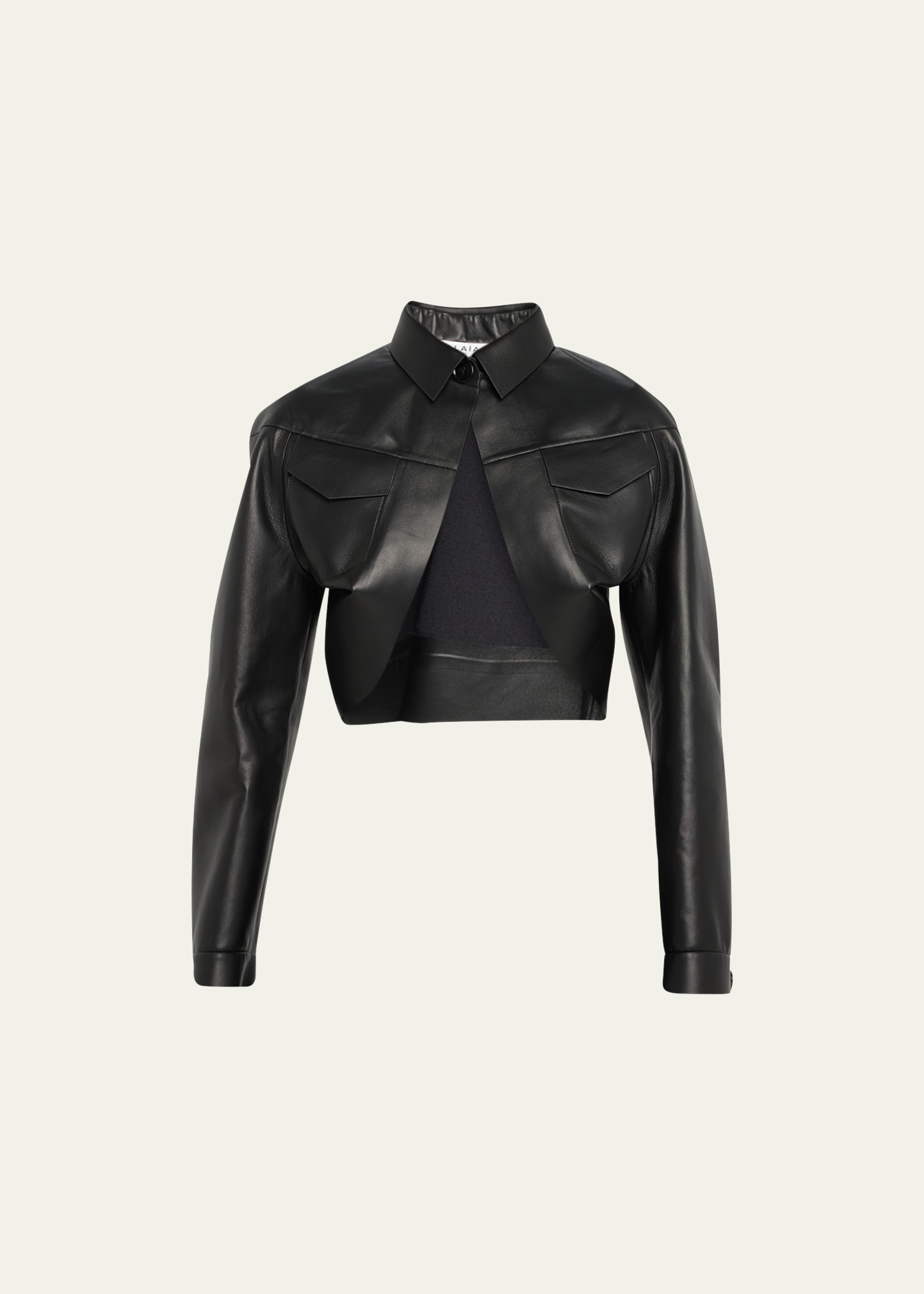 ALAIA cropped leather shrug jacket Spread collar; button closure Long sleeves Front patch pockets Cropped at the midriff Relaxed fit Lambskin leather Lining: Elastane Made in Italy