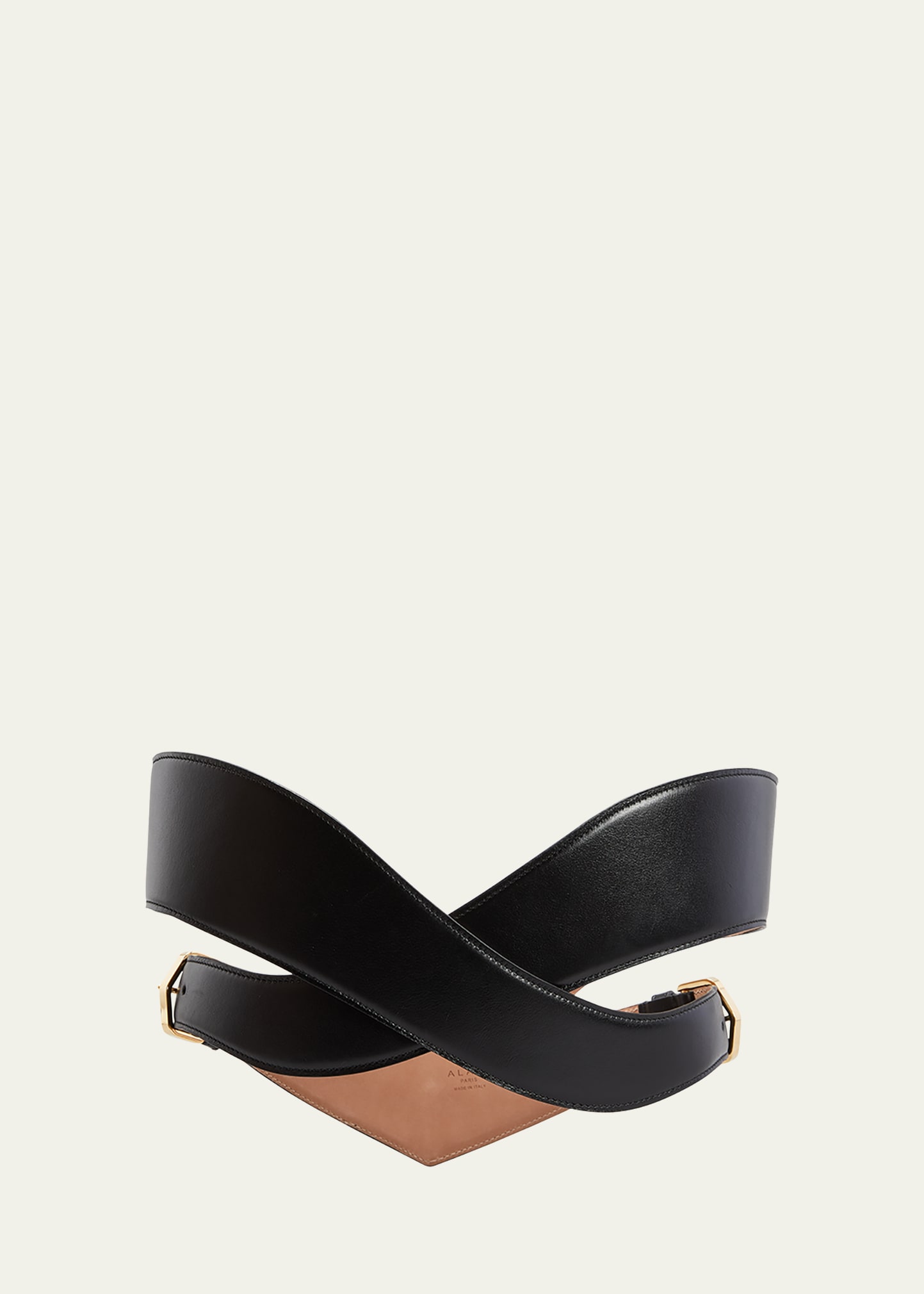 ALAIA thick leather belt with a crossover styling Buckle closure at sides; adjustable Gold-tone hardware Calf leather Made in Italy