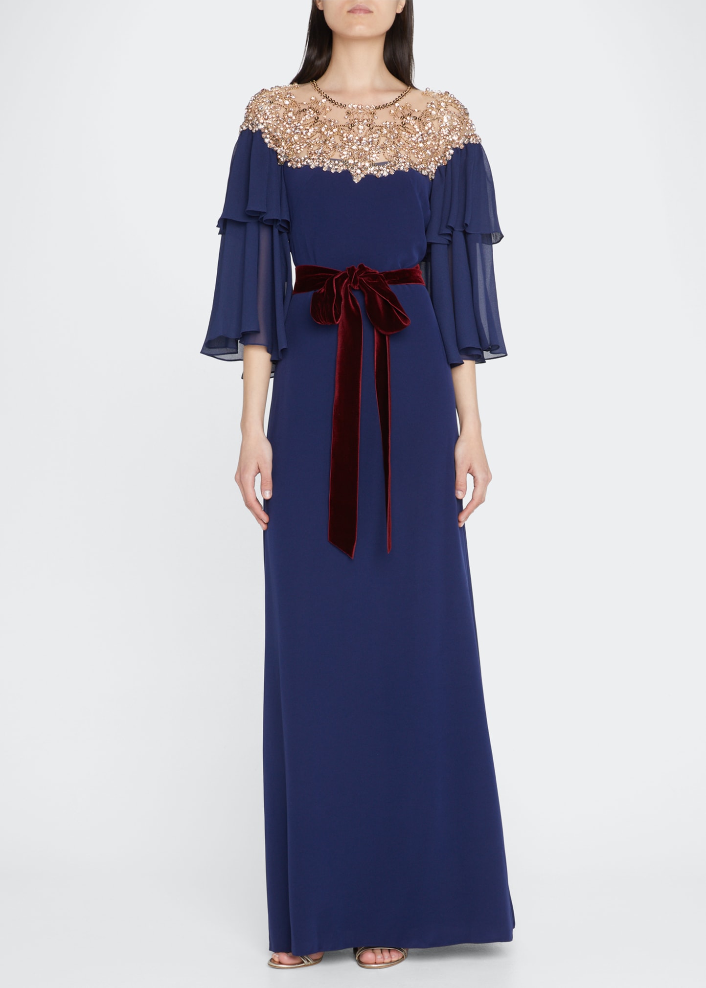 Jenny Packham gown with beaded and crystal-embellished neckline Round neckline; keyhole back Three-quarter tiered sleeves Waist self-belt A-line silhouette Floor length Back zip Acetate/polyester Imported