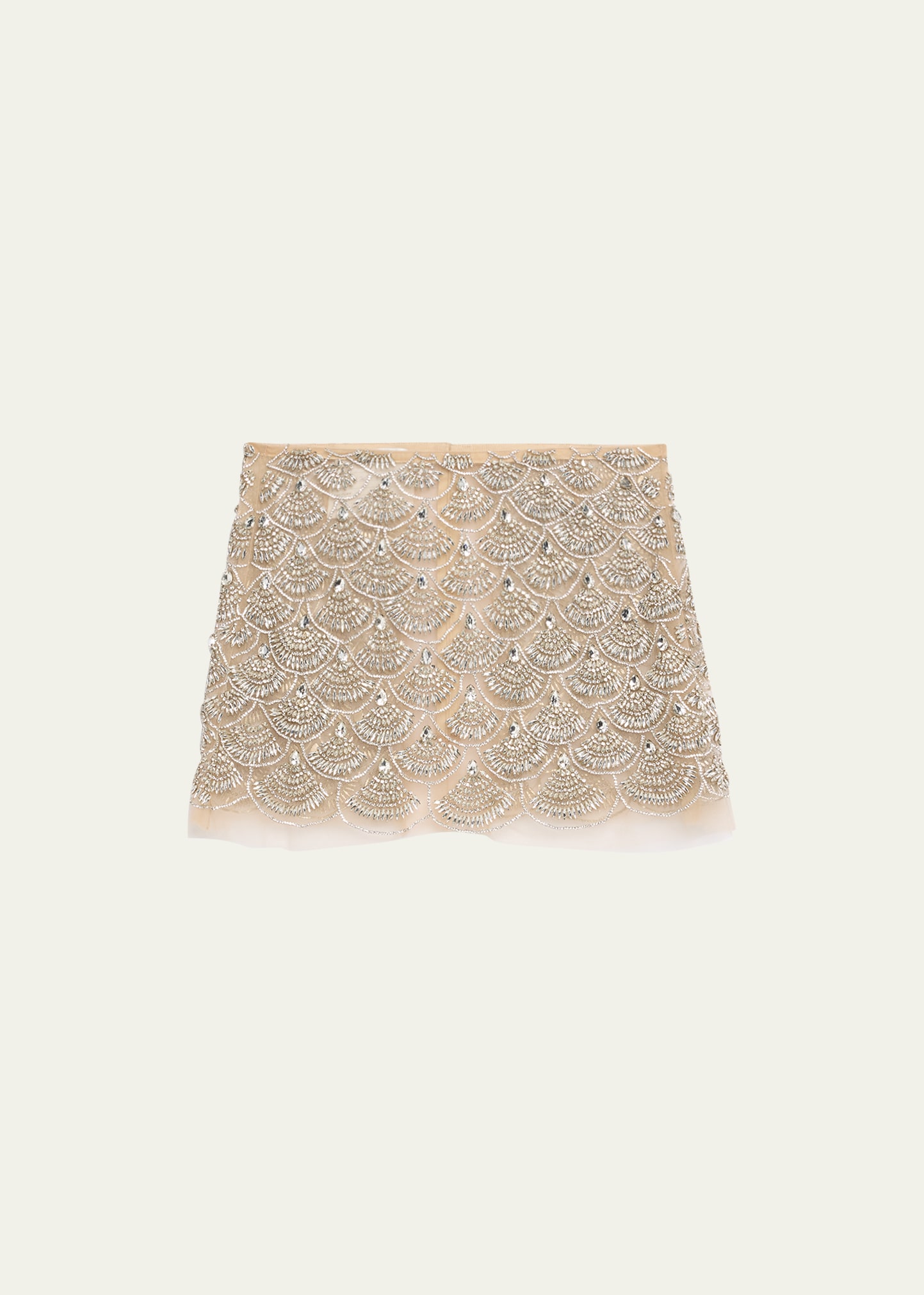 Oscar de la Renta semi-sheer mesh skirt in a crystal-embellished scallop design High rise Hem falls above the knee A-line silhouette Nylon/polyamide Lining: Silk Dry clean Imported