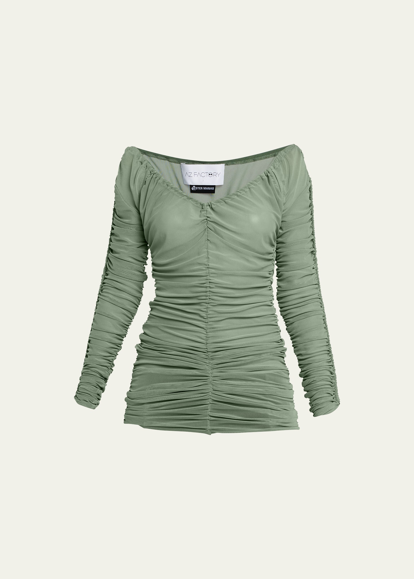 AZ Factory mesh top with ruched detail Scoop neckline; cutout back Long sleeves Slim fit Pullover style Polyester/elastane Made in Portugal