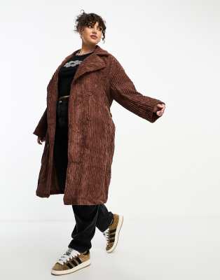 Daisy Street Plus midi corduroy coat with tie wrap waist in chocolate-Brown