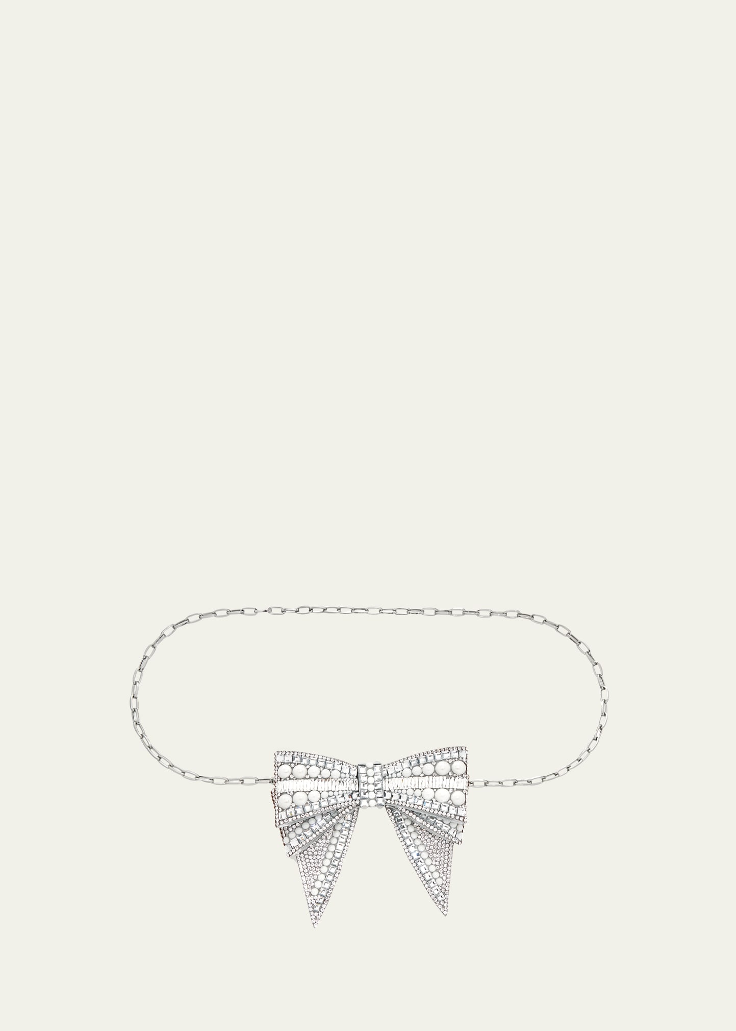 Judith Leiber Couture brass chain belt with deco hotfix crystal bow Approx. 38"L Adjustable fit Lobster clasp closure Lining: satin Care instructions: To ensure years of satisfaction, do not subject your product to extreme temperatures. If an item should be exposed to rain, please wipe carefully with a soft cloth to minimize any markings that may occur. Imported